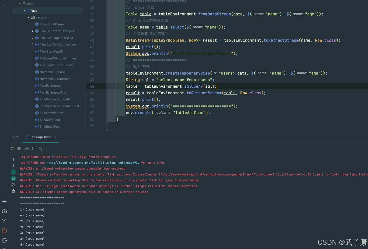 // =======================        // Table 方式        Table table = tableEnvironment.fromDataStream(data, $("name"), $("age"));        // 对Table的数据查询        Table name = table.select($("name"));        // 将数据输出到控制台        DataStream<Tuple2<Boolean, Row>> result = tableEnvironment.toRetractStream(name, Row.class);        result.print();        System.out.println("=========================");        // =======================        // SQL 方式        tableEnvironment.createTemporaryView("users",data, $("name"), $("age"));        String sql = "select name from users";        table = tableEnvironment.sqlQuery(sql);        result = tableEnvironment.toRetractStream(table, Row.class);        result.print();        System.out.println("=========================");        env.execute("TableApiDemo");    }