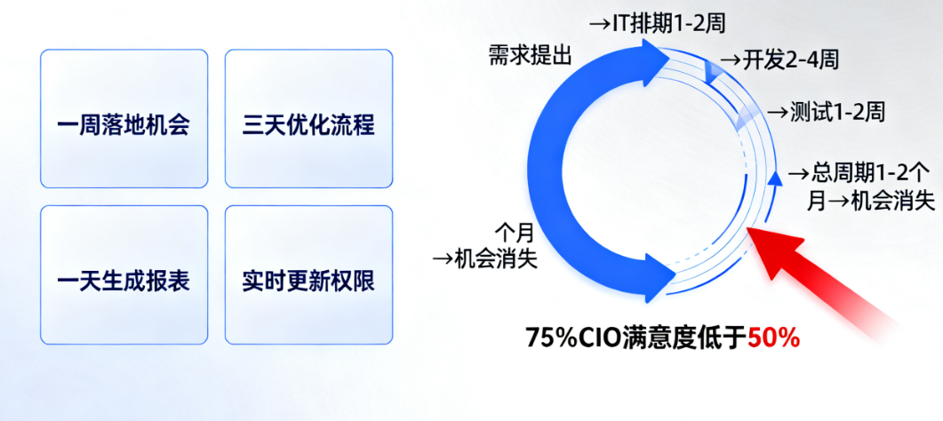 调研数据显示,75%的企业 CIO 表示,业务部门对 IT 响应速度的满意度低于 50%,而 60%的业务机会因系统响应迟缓而错失。
