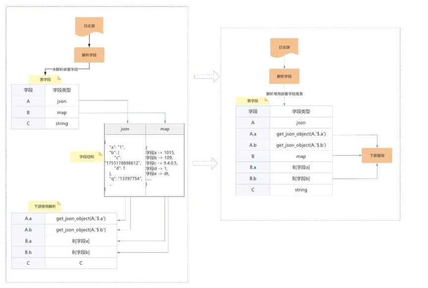 此外,原始日志结构中普遍存在的复杂嵌套格式(如多层 JSON、数组结构等)大幅增加了数据清洗和解析的复杂度。大量业务自定义字段缺乏统一规范,导致解析逻辑冗余且低效,进一步降低了整体处理性能。这些因素共同加剧了数据处理的延迟与资源消耗,形成系统性瓶颈。