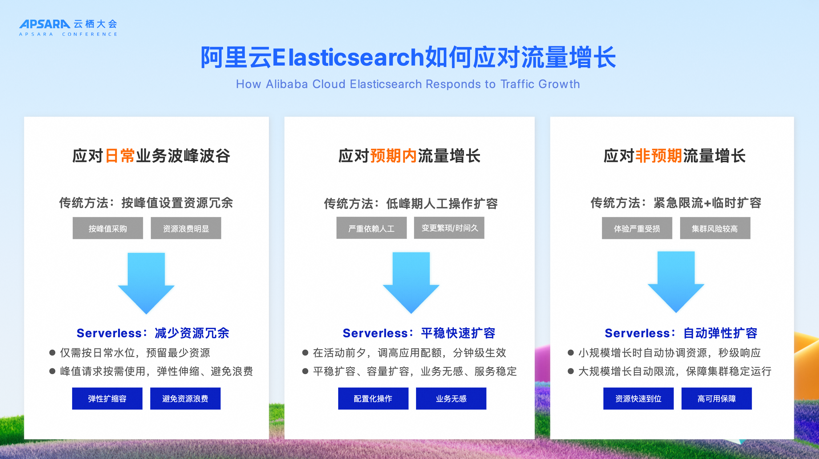 1、阿里云 ES 应对不同类型流量增长的 Serverless 策略: