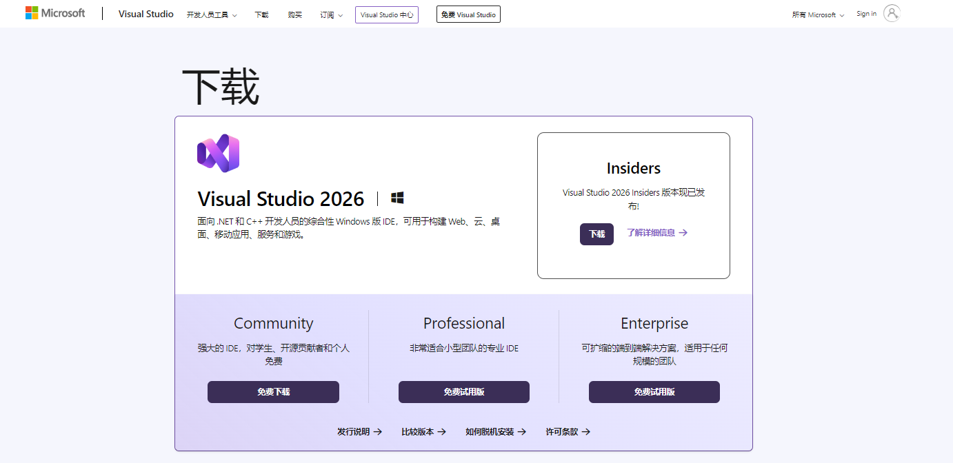 Visual Studio 2026 发行说明: https://learn.microsoft.com/zh-cn/visualstudio/releases/2026/release-notes