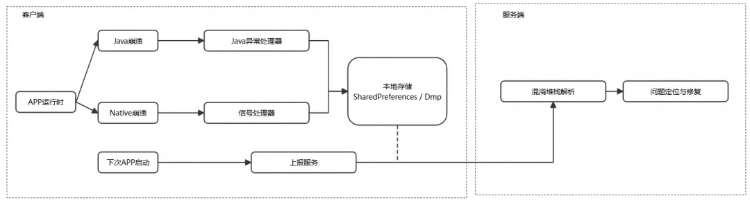 为了全面应对这些挑战,我们设计了一个统一的异常采集方案,遵循“捕获-持久化-上报-解析”的生命周期。无论是 Java 还是 Native 崩溃,客户端的核心任务都是可靠地将现场信息保存到本地。真正的解析和分析工作则交由服务端完成。