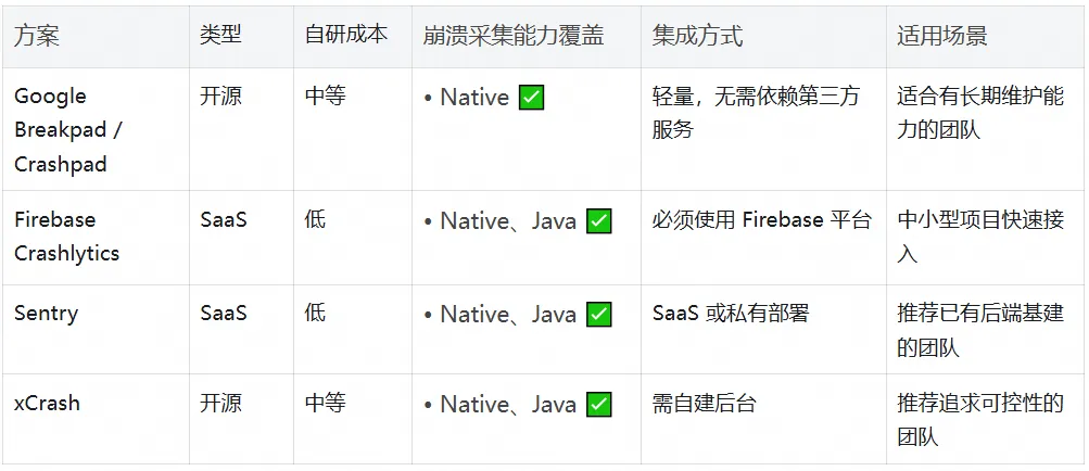 Google Breakpad/Crashpad:它们是 Native 崩溃捕获的“黄金标准”,提供了从信号捕获、Minidump 生成到后台解析的全套工具链。它们是许多商业方案的技术基石,但自行集成和后台搭建成本较高。