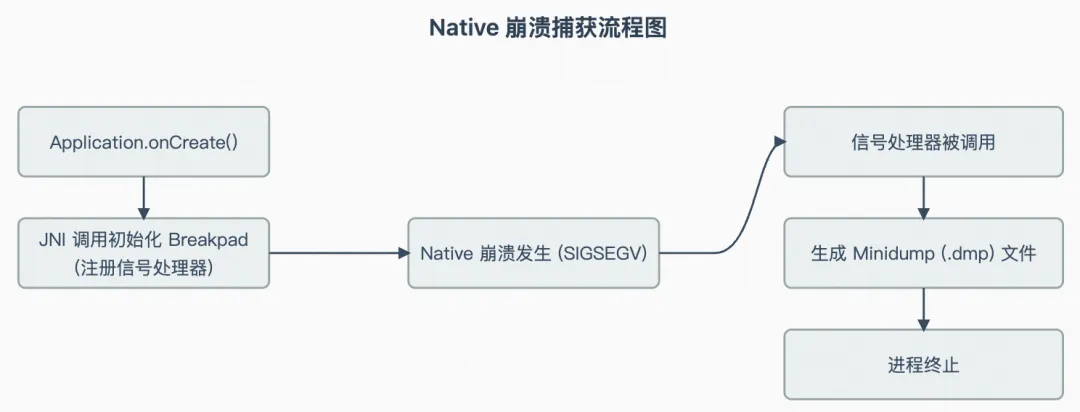 1. 初始化:在 App 启动时,我们初始化 Native 库,并为其提供一个专用的目录来写入崩溃转储文件(crash dump)。