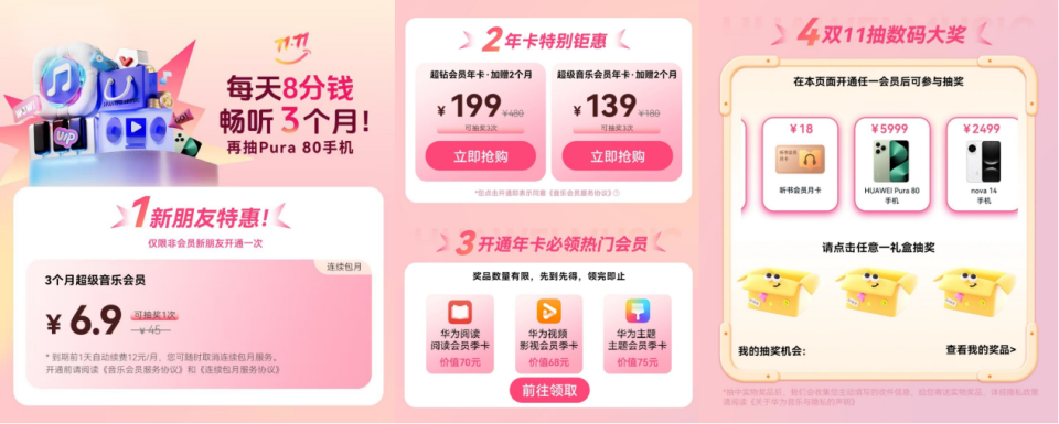 双十一期间,华为音乐也推出超值福利,超钻会员年卡加赠 2 个月,到手价仅 199 元。升级鸿蒙 5 及以上用户开通年卡还能领取华为阅读、视频、主题等联合会员季卡。所有会员还可参与全年仅 1 次的年卡大秒杀,还可参与抽奖,有机会获得 Pura 80 手机、HUAWEI Sound X4 音箱等好礼。新朋友还有特别福利,6.9 元畅听三个月,算下来每天只要 8 分钱!