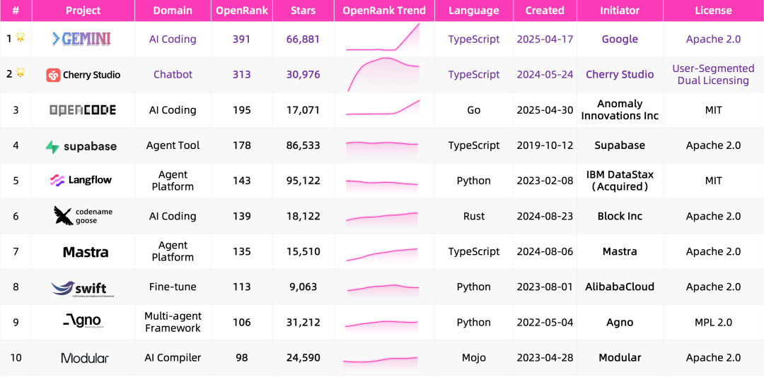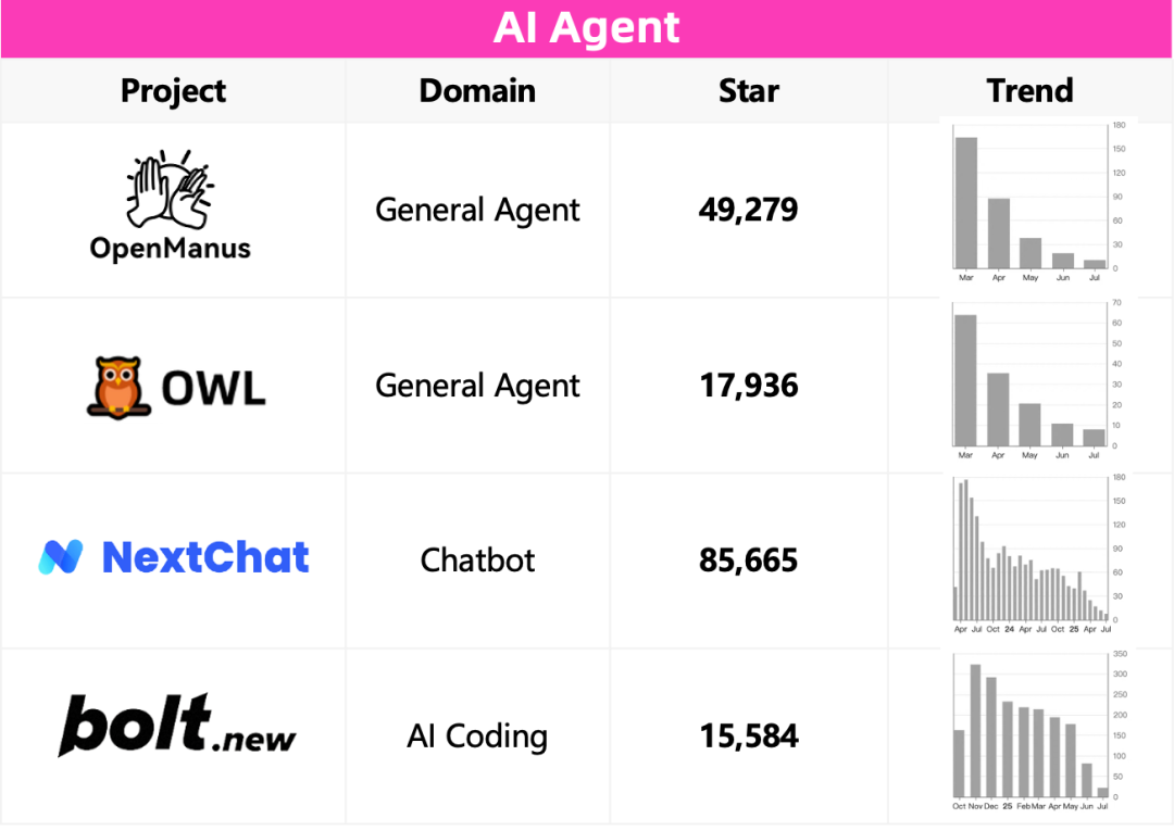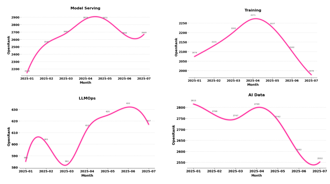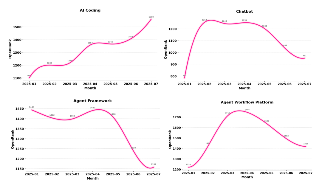 从今年的技术领域发展趋势来看,AI Coding、Model Serving 和 LLMOps 整体处于增长的态势,尤其是 AI Coding 的增长斜率在近两个月还在持续攀升,再次印证了 AI 研发提效是 2025 年真正被验证和落地的应用场景;Agent Framework 和 AI Data 是下跌比较明显的两个领域,Agent 开发框架的下跌和曾经在头部的 LangChain、LlamaIndex、AutoGen 等项目在社区投入上的显著收缩有很大关系,而 AI Data 在向量存储、数据集成及数据治理等维度上,也表现出在平稳中逐步下降的趋势。