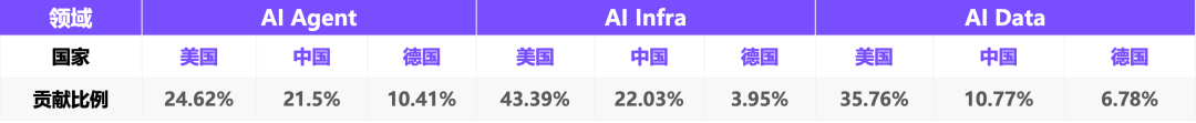 从三大技术领域下的国家贡献度分布来看,在 AI Infra 领域,中美开发者在基础设施领域的贡献度达到 60% 以上,排名第三的德国不足 4%;AI Data 领域全球的参与情况更平均,欧洲各国,如波兰、挪威、法国、荷兰等国的参与度均进入全球前十;AI Agent 领域,中美开发者贡献度占比分别为 24.6% 和 21.5%,而中国开发者在 Agent 层面相较其他领域的投入更多。