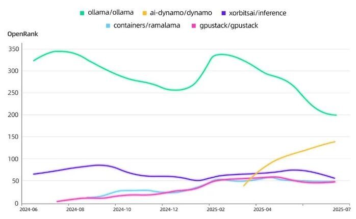 从背后的发起力量来看,我们看到了来自学术界的创新迸发出的高影响力:vLLM、SGLang、Ray 都生长于 Ion Stoica 执掌下的伯克利实验室;Meta、Google、NVIDIA 这些大厂掌控或布局在一些关键节点之上,但在靠近应用层的位置,Dify、Cherry Studio 这样的独立团队也能够迅速创新,通过提供用户友好的工具,形成快速增长点。