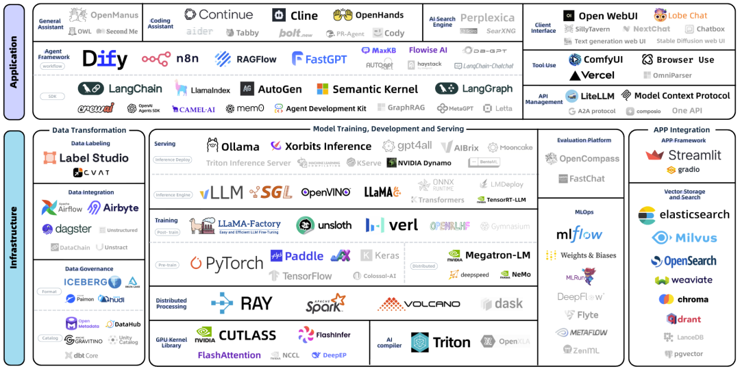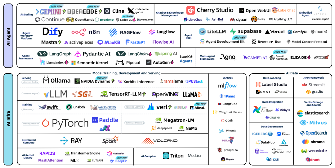 和 3 个月前的第一个版本相比,除了最明显的项目更替之外,我们也对整体的生态结构和领域做了合并、拆分和描述的调整,例如,将笼统的 “Infrastructure” 和 “Application” 的一级分类描述修改为更加具体的、也已经在逐渐发展出清晰技术边界的“AI Infra”、“AI Agent” 和 “AI Data”。技术仍在高速的发展,尤其在 Agent 领域,项目之间的定位和边界必然会随着技术发展而动态演化,我们可以通过 Landscape 的变化,观察到一个新的技术生态从混乱逐渐归为有序的过程。