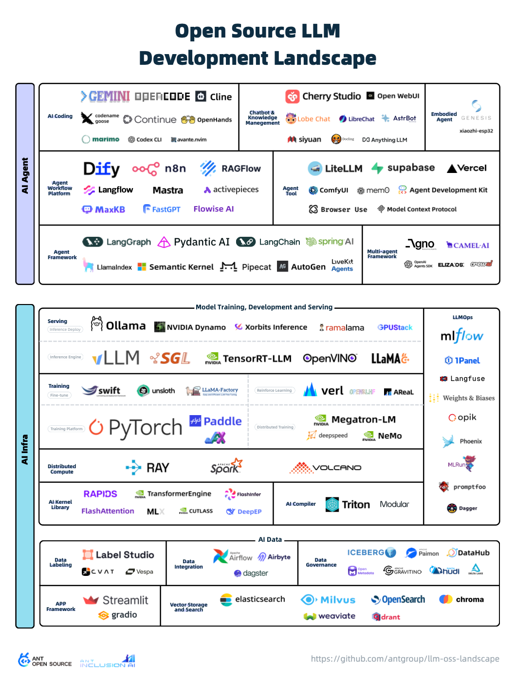 3 个多月前,在一年一度的「527 蚂蚁技术日」上,蚂蚁开源联合 Inclusion AI 首次发布了一份大模型开发生态下的开源项目全景图,和一份对生态趋势的洞察报告。我们希望能依据对社区的洞察,指出生态中哪些项目是最应该跟踪、使用和参与的,反之亦然。