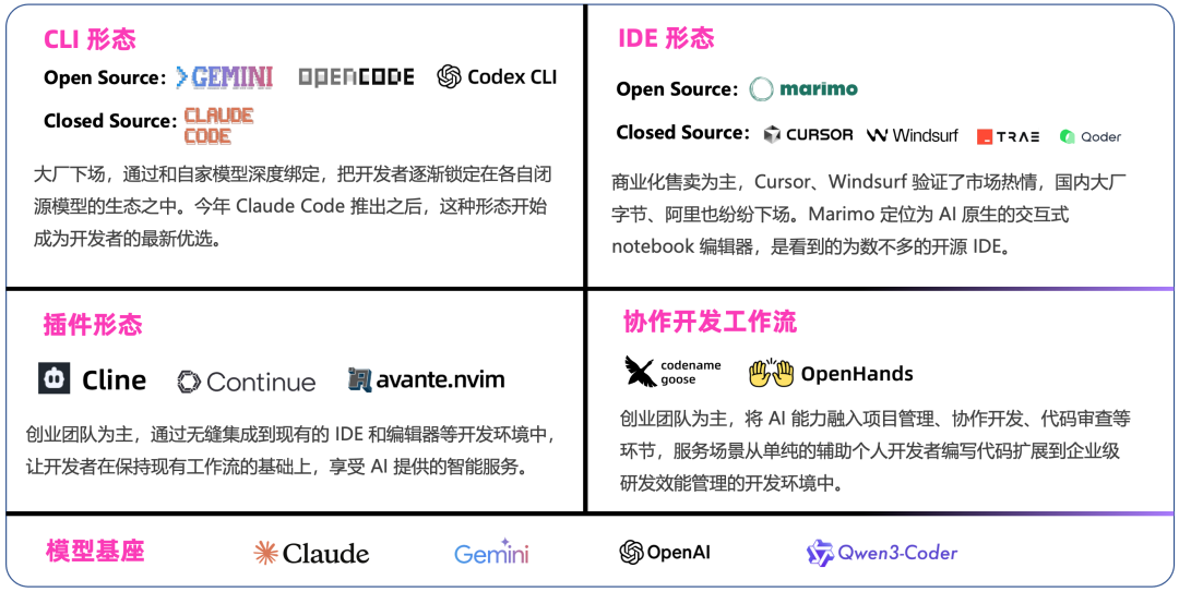 从最初的单一代码补全功能发展到如今的多模态支持、上下文感知与协同工作流,AI Coding 的核心技术在不断进化。CLI 工具如 Gemini CLI 和 OpenCode 利用 AI 模型的强大推理能力,将开发者的需求转化为更高效的编程体验;与此同时,插件形态的工具,如 Cline 和 Continue,通过无缝集成到现有开发平台中,让开发者在保持现有工作流的基础上享受 AI 提供的各种智能服务,极大地提升了开发效率。Goose 和 OpenHands 等协作开发平台,将 AI 能力融入团队项目管理、代码审查、任务分配等各个环节,推动了跨地域、跨职能的团队协作。而 Claude Code、Cursor 和 Windsurf 等闭源的商业化项目,也吸引了大量个人开发者和企业客户。随着市场需求的提升,AI Coding 的商业化潜力巨大,付费订阅、SaaS 服务、增值功能等将成为未来的主要盈利模式。