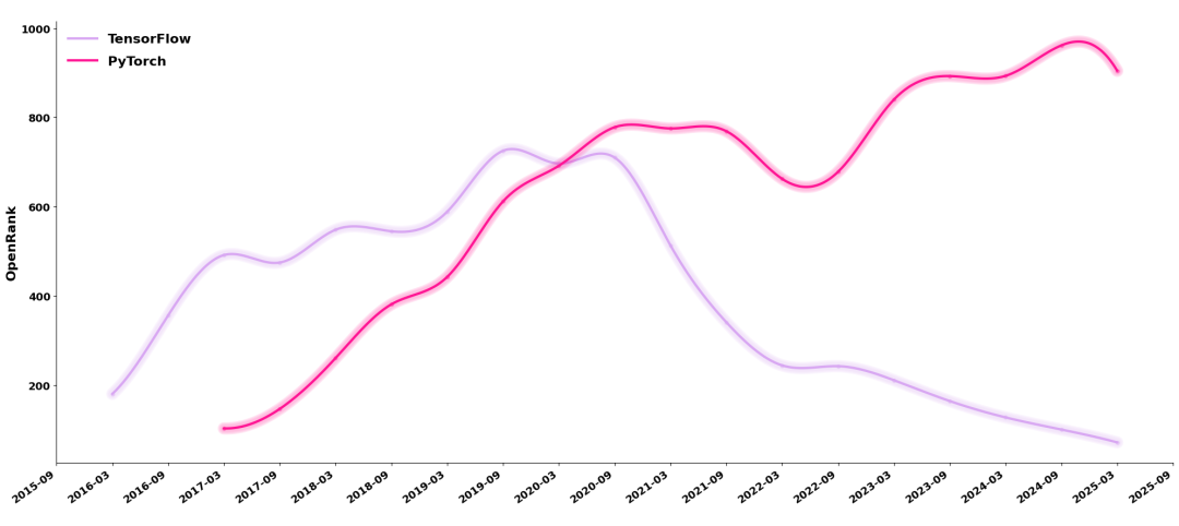 2019 年 10 月,TensorFlow 发布了 2.0 版本,借鉴了 PyTorch 的核心理念,简化了模型构建。然而,这种技术上的合理转变却付出了巨大的代价:由于缺乏无缝的向后兼容性,以及复杂的迁移工具,许多已经转向 PyTorch 的开发者不愿意承担迁移遗留的 1.x 代码和学习新 API 的负担,从而对 PyTorch 的忠诚度更加坚定。正是在这个时间点,PyTorch 社区正式超过了 TensorFlow,两个项目也从此走向了分化的发展曲线。