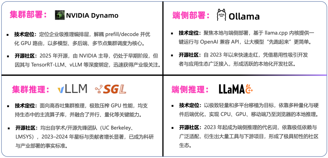2023 年以来的快速演进已经让模型服务成为连接 AI 基础设施与应用层的关键中间件。一方面,vLLM、SGLang 等代表性的推理引擎项目不断在高吞吐、长上下文、多用户并发的场景里打磨出极致性能,另一方面,Ollama、llama.cpp 等则推动了本地可用性和生态扩散,让大模型“跑在你手边”成为现实。同时,NVIDIA Dynamo 这样的编排框架正在把单机高效推理扩展到多节点、多模型、多租户的集群层面。