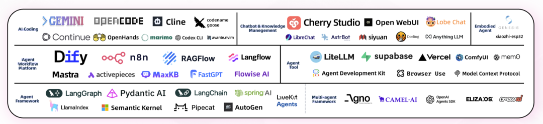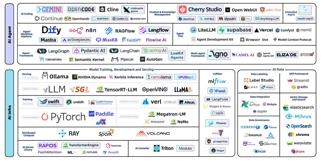这张全景图整体分为 AI Infra 和 AI Agent 两大技术方向,收录了 114 个在这个生态下最顶尖也最受关注的开源项目,这些项目分布在 22 个技术领域。