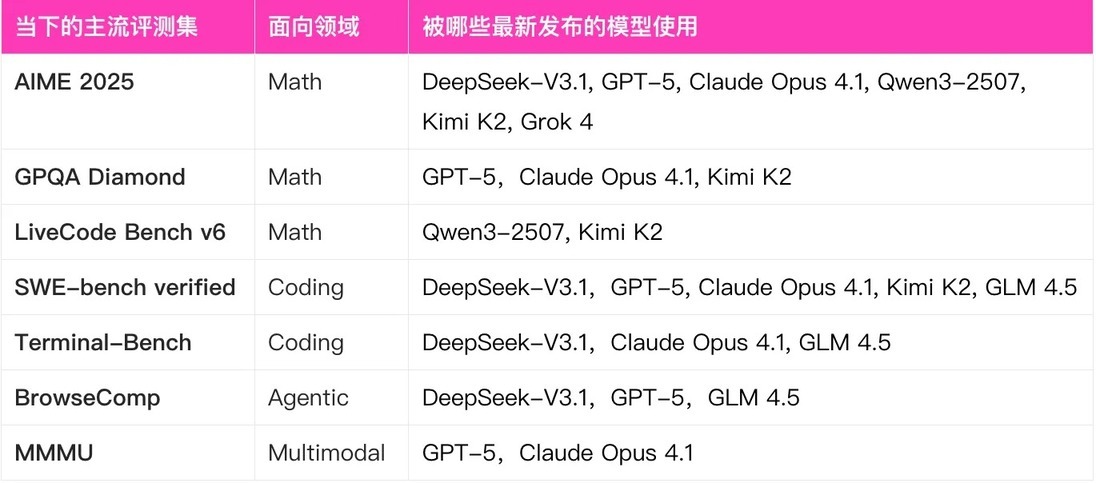 基于客观标准答案的评测,下表梳理了最近两个月新模型发布时主要提及的性能对比评测集,可以作为当下最顶尖也最前沿的评测集的代表: