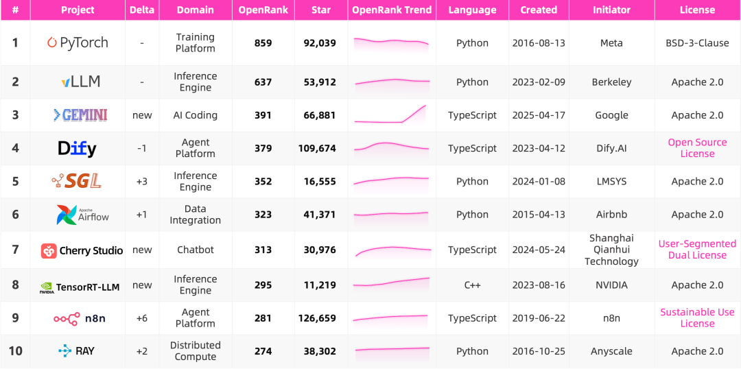 头部的这 10 个项目,代表了当下大模型开发生态里最活跃、最具代表性的社区力量。它们几乎覆盖了模型生态的完整链路:从底层的算力和框架 PyTorch、Ray,模型训练的数据处理管线 Airflow,模型服务的性能基座 vLLM、SGLang、TensorRT-LLM,到 Agent 应用调度平台 Dify、n8n,直接面向开发者与终端用户的 Gemini CLI、Cherry Studio。