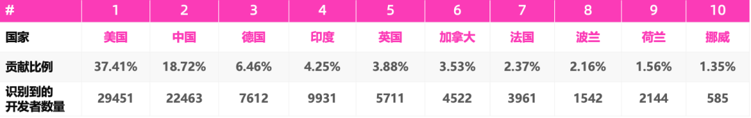 总体来看,美国以 37.4% 的贡献领先,中国以 18.7% 位居第二,这两个国家的贡献总比例达到 55% 以上,而排名第三的德国已降低至 6.5%。