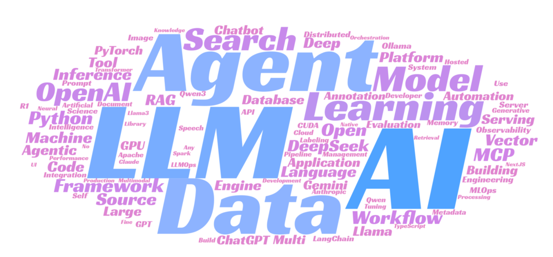 把上述大模型开源开发生态全景图中所有的开源项目在 GitHub 首页填写的 description 和 topics 中的内容作为文本提取关键词,并在提取过程中做一些基本的规则化处理:大小写和单复数合并(MCP & mcp、agents & agent 等),去除常用词(a、an、and 等)。我们最终得到一张这样的词云图,图中一共有 100 个单词,总结了当下大模型开发生态的技术关键词。其中,最高频出现的词语为: