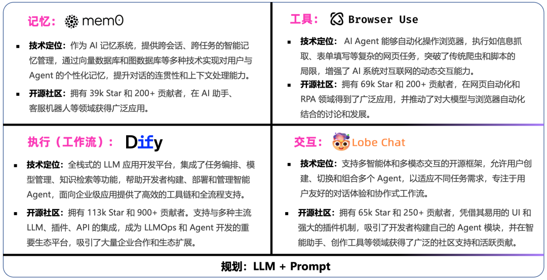 人们常说 2025 年会是 AI 应用真正落地的一年。最初,是 LangChain、LlamaIndex 等框架提供了基础的 Agent 搭建方式;随后,开源生态中出现了专注于不同环节的项目,如 Mem0(记忆)、Browser-Use(工具调用)、Dify(工作流执行)、LobeChat(交互界面),开源社区正在构建完整的拼图,为更强大的自治 AI 系统打下基础。每个项目聚焦的方向不同,但目标一致:让 AI 更加智能地理解、记忆、行动和交互,从而真正解放生产力。