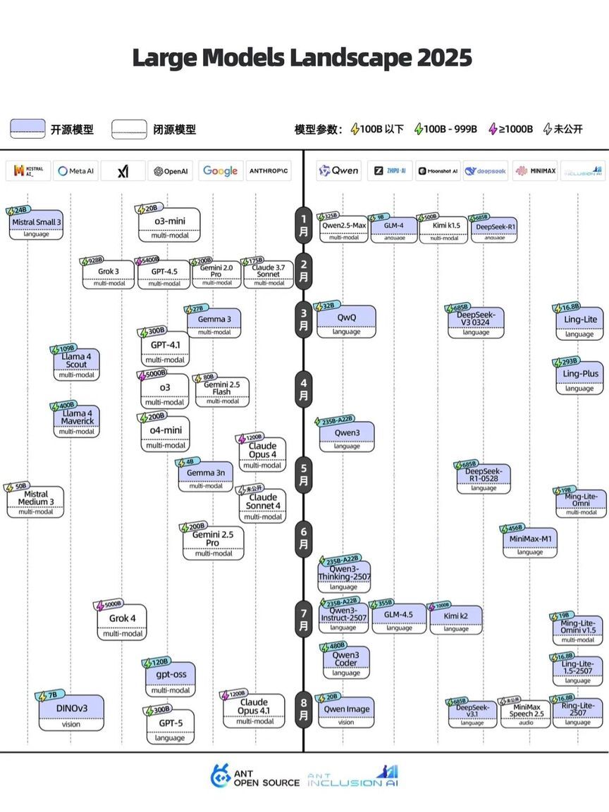在开源开发生态之外,大模型也在进行着高频的发布。虽然目前还没有很好的数据渠道来帮助我们理解大模型社区,但毕竟它们处在注意力焦点的中心。因此,我们也精心梳理了 2025 年 1 月至今国内外主流厂商的大模型发布时间线,包含开放参数的模型和闭源模型。这张全景图内也标注了每个模型的参数、模态等关键信息,来一定程度上帮助理解当下各家厂商的白热化竞争究竟是在哪些方向上展开的。以此,我们得出了一些有趣的观察,比如: