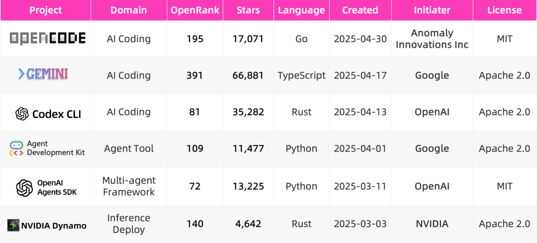 在这些 2025 发起的新势力项目中,OpenCode 来自于创业公司 Anomaly Innovations,并且在发起之日就定位为是 Claude Code 的 100% 开源替代。在剩下的几个项目中,我们可以看出大公司们在模型服务、Agent 开发工具链和 AI Coding 上的开源布局: