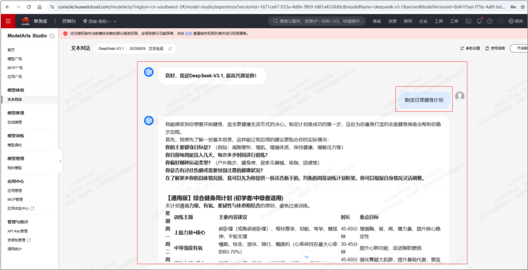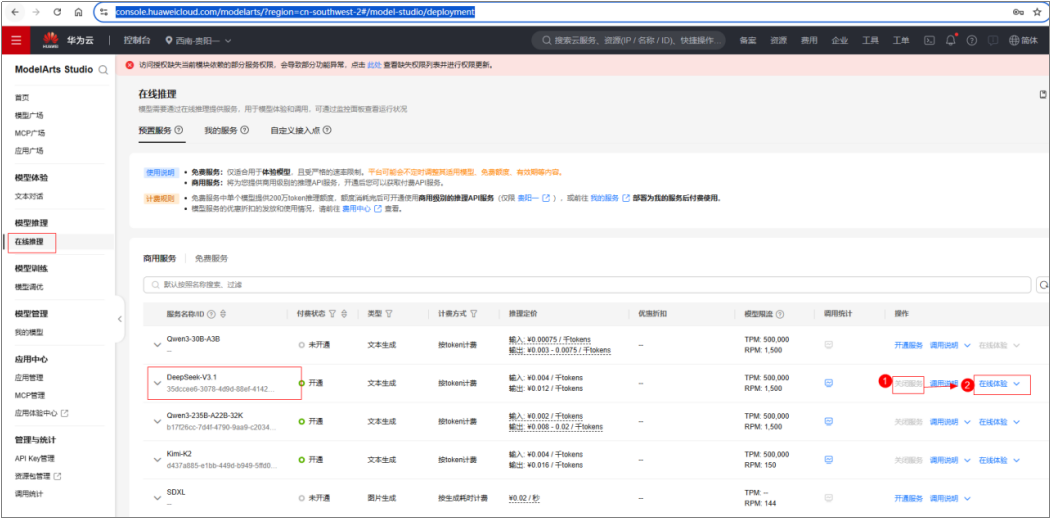 访问Maas后台,点击”开通服务—>在线体验”(需选择商用服务的模型):