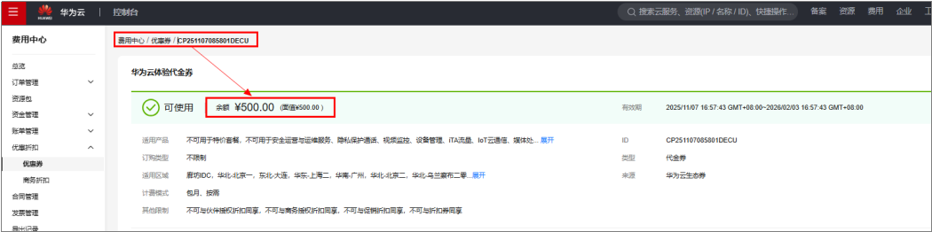 审核通过后,500 元代金券立即发放到账户中,可以在“费用中心–优惠折扣- 优惠券”页面查看详情