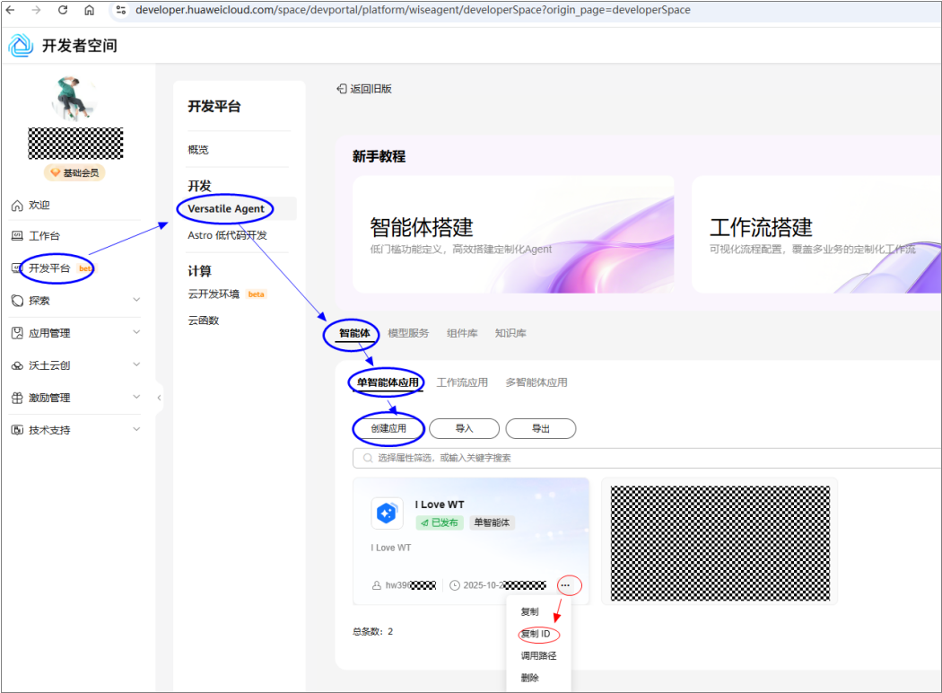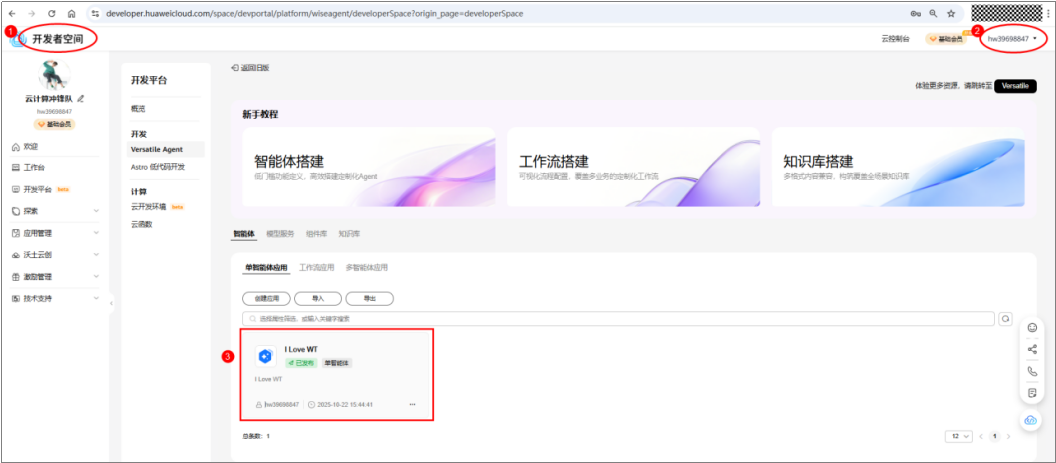 访问开发者空间,如下图蓝框,依次访问“开发平台 - Versatile Agent – 智能体–单智能体应用-创建应用”,输入应用名称及描述,基于需要增加 MCP 等服务,发布应用成功后。