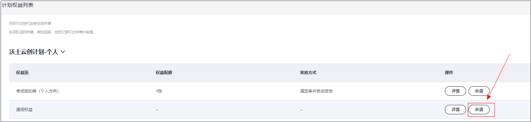 “开发者空间 - 激励管理- 计划权益- 沃土云创计划-个人”中找到“通用权益”,点击 “申请”。