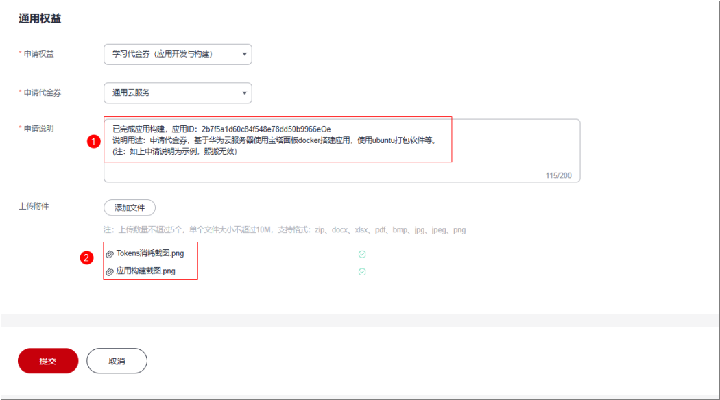申请说明中,需加上已构建应用的应用 ID 及券的用途(重要!),并增加附件(须含 2 张截图,截图要点在上文中),示意如下: