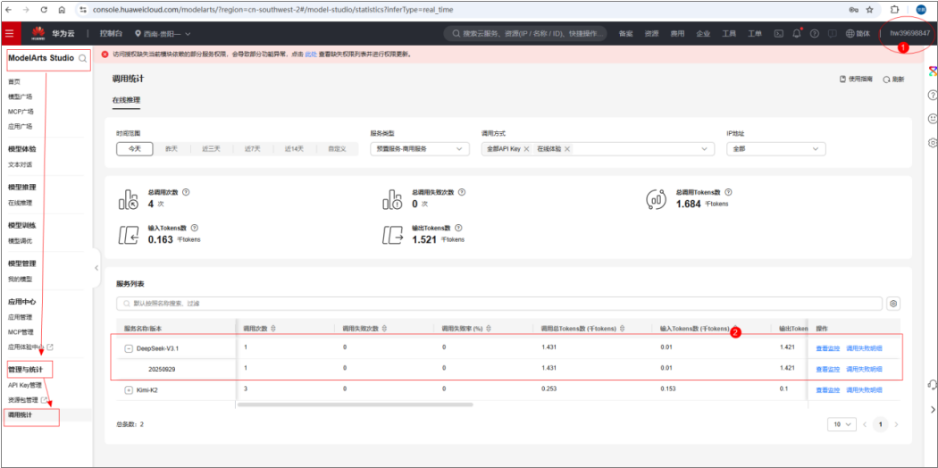 到如下位置,进行 Tokens 消耗截图(重要!务必截上如下图①②部分)