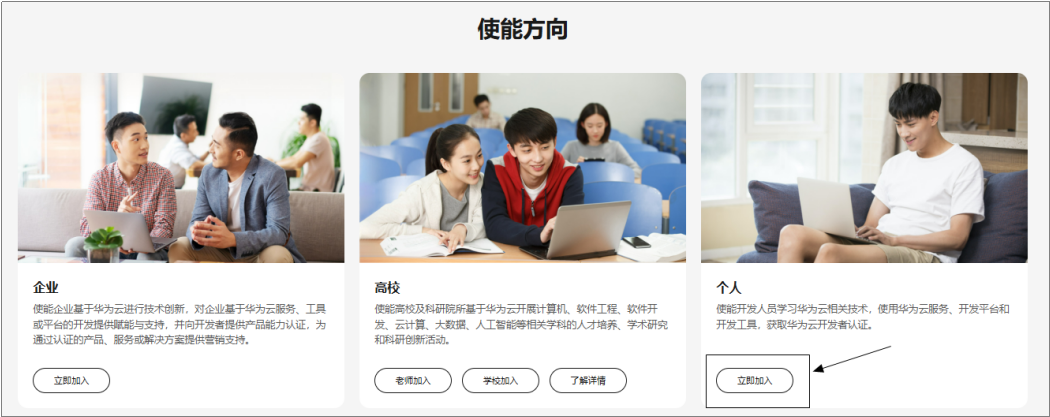 进入沃土云创计划_开发者中心-华为云,注册账号,实名认证后,使能方向选择“个人”跳到“开发者空间”,填写相应的信息,提交后,等审核通过。