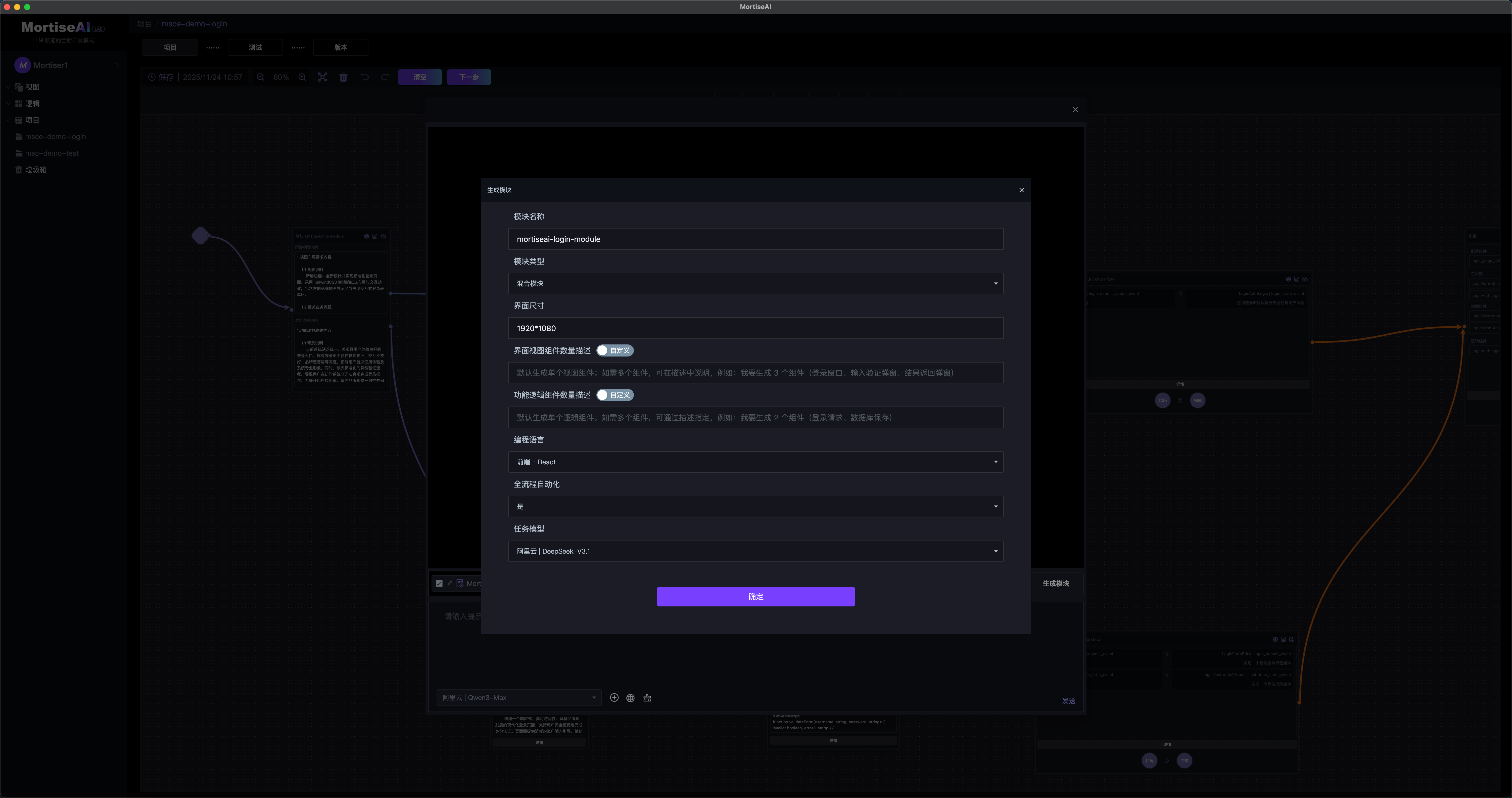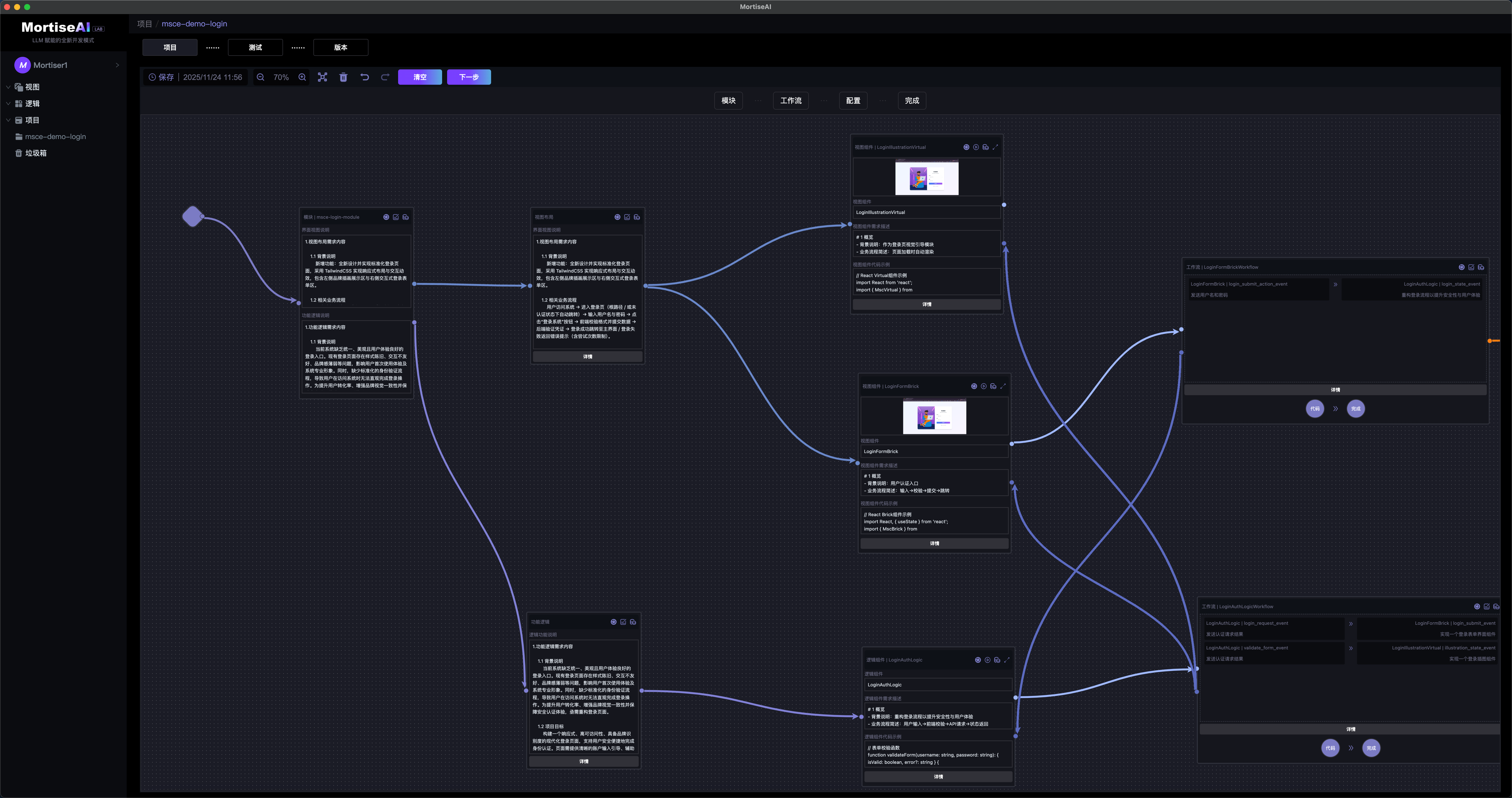 MortiseAI 采用 Agent 端到端生成模式,交互形式以工作流方式为核心,将 Spec 生成代码过程结构化、标准化、可视化,从而让复杂项目生成过程透明、可控、可持续迭代优化。