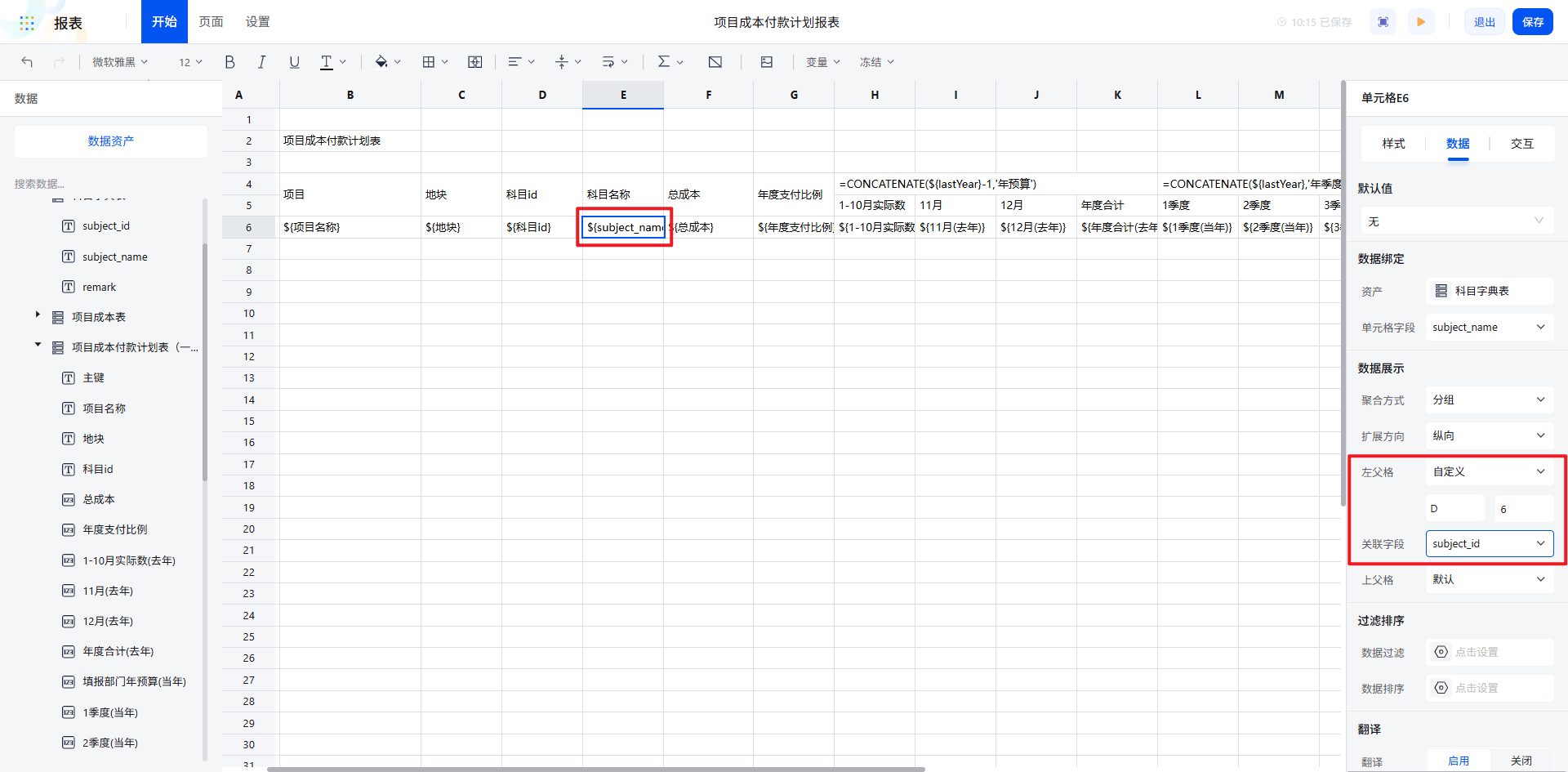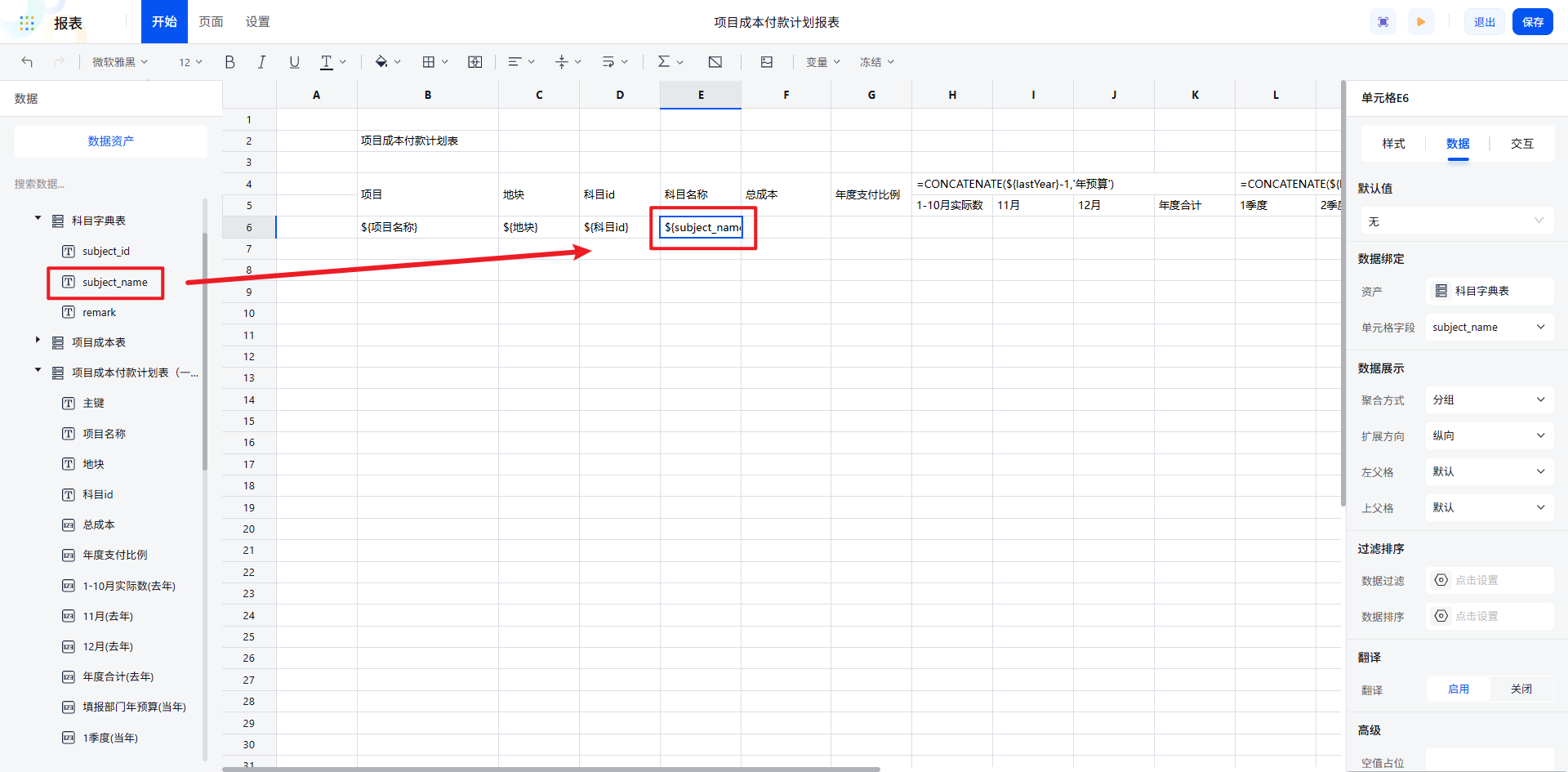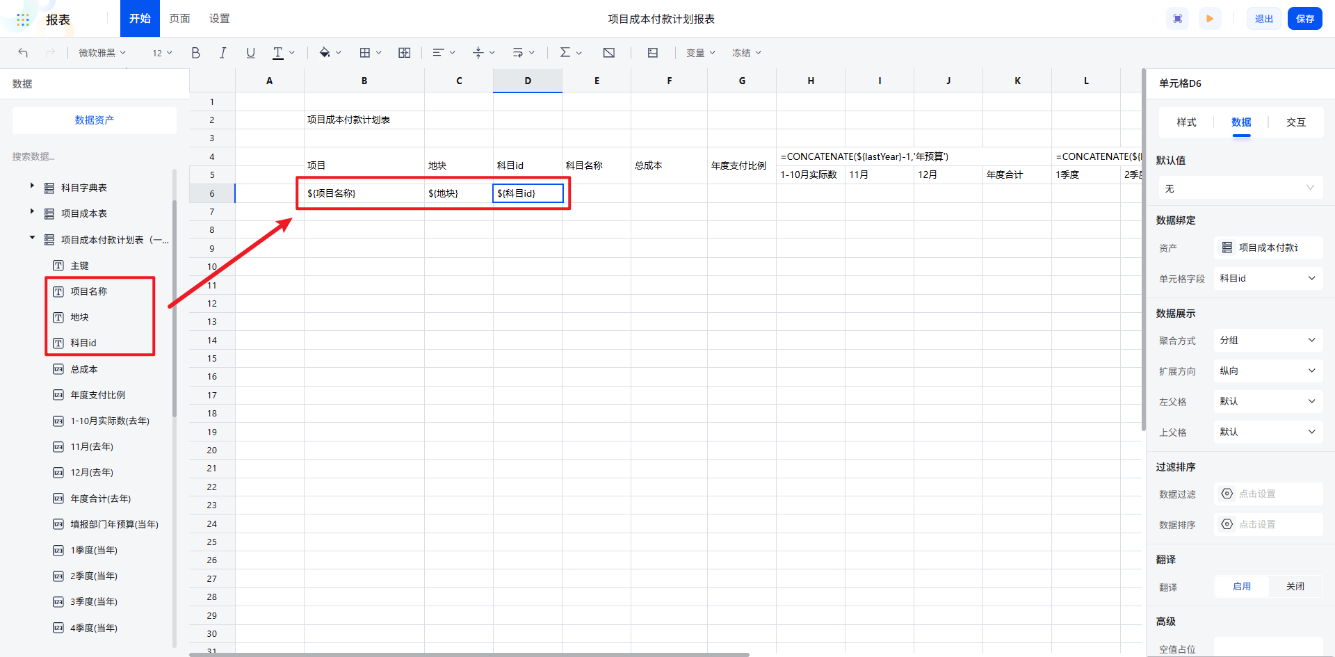 例如,从“项目成本付款计划表”中拖入“项目名称”“地块”“科目 ID”等字段,实现数据的快速对接。