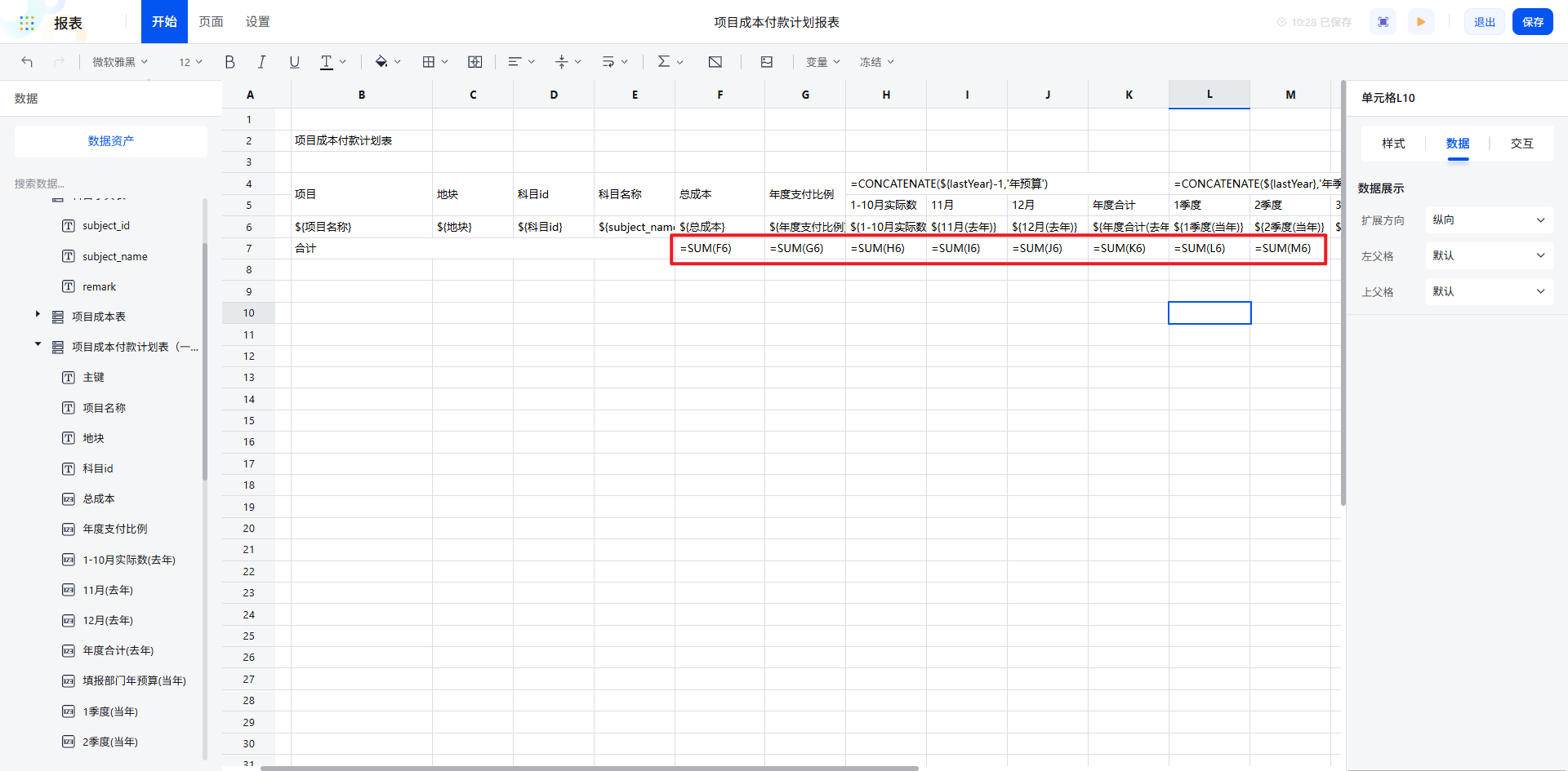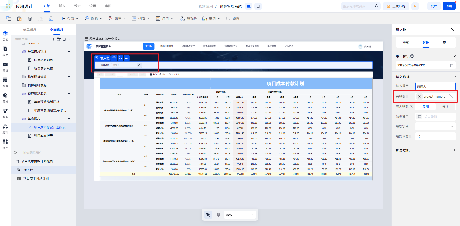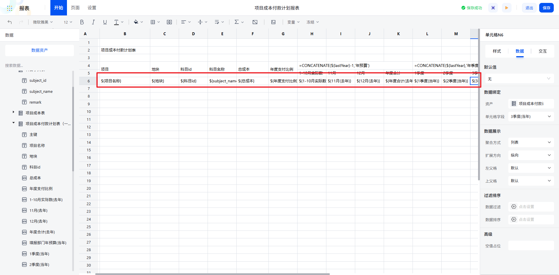 例如,从“项目成本付款计划表”中拖入“项目名称”“地块”“科目 ID”等字段,实现数据的快速对接。