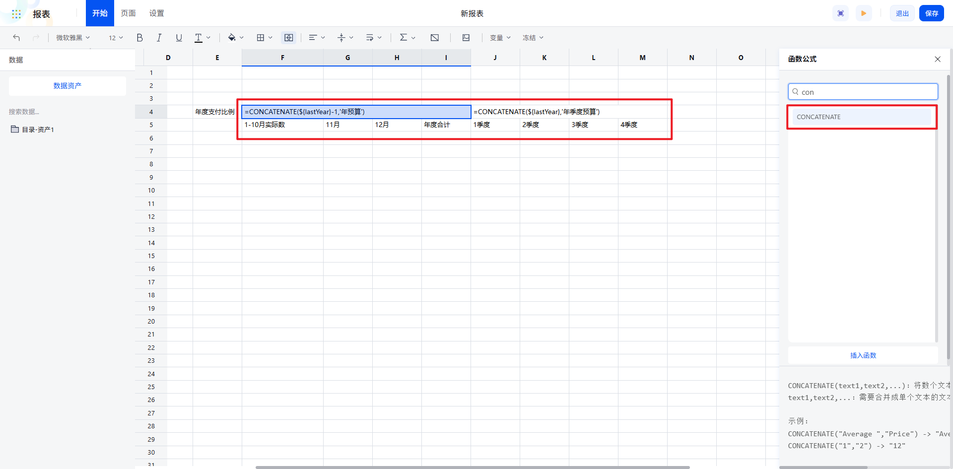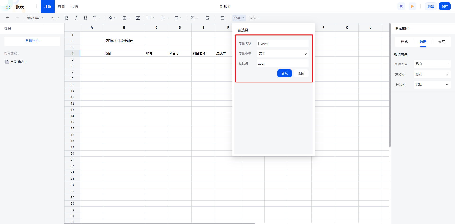 报表变量:为提升报表的灵活性与可复用性,针对“去年预算”“今年预算”等时间相关字段,可通过变量配置实现动态标题。新增年度变量并设定默认值,再通过函数将变量与字段拼接生成表头,确保年度变更时标题自动同步更新。