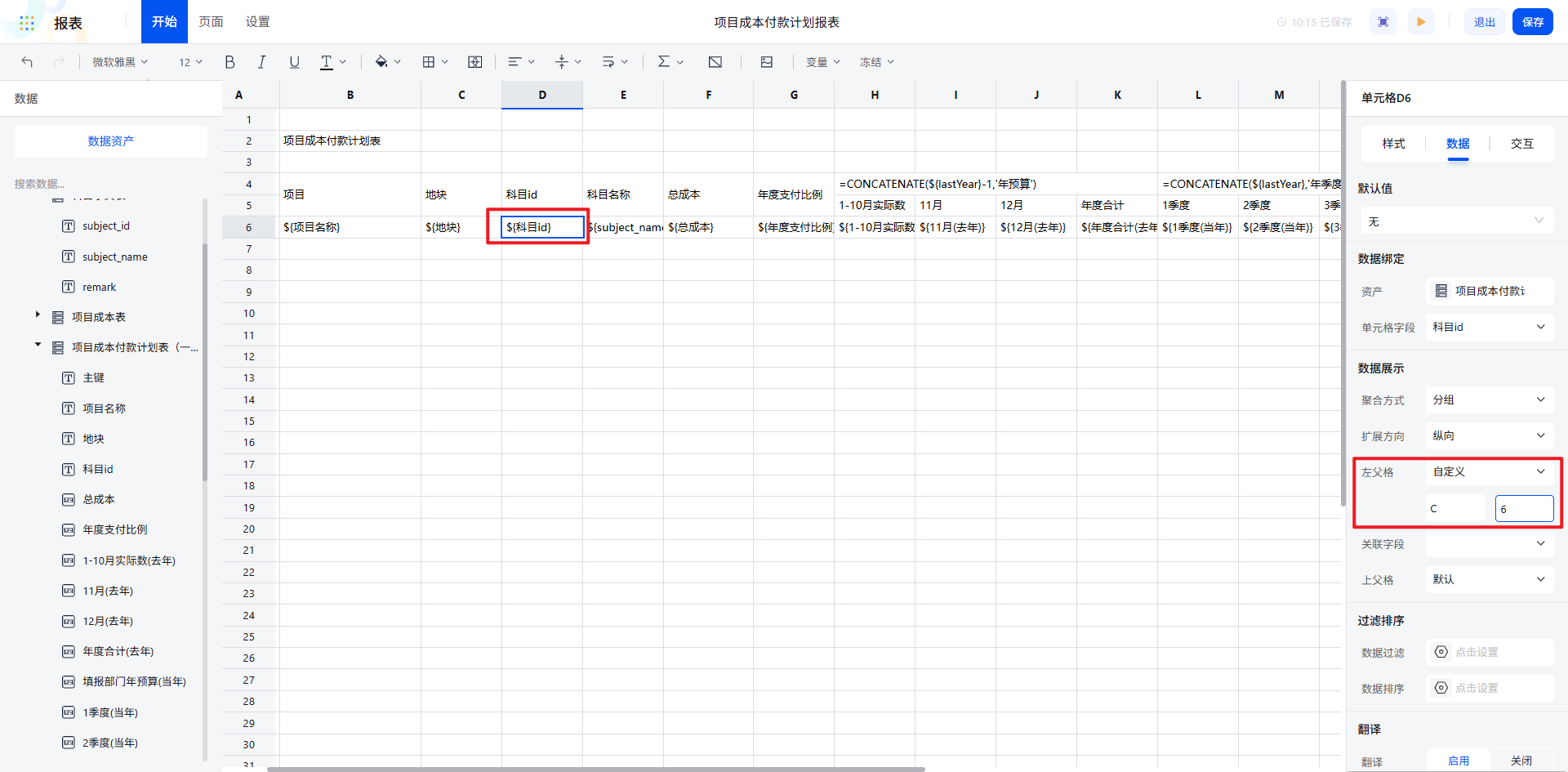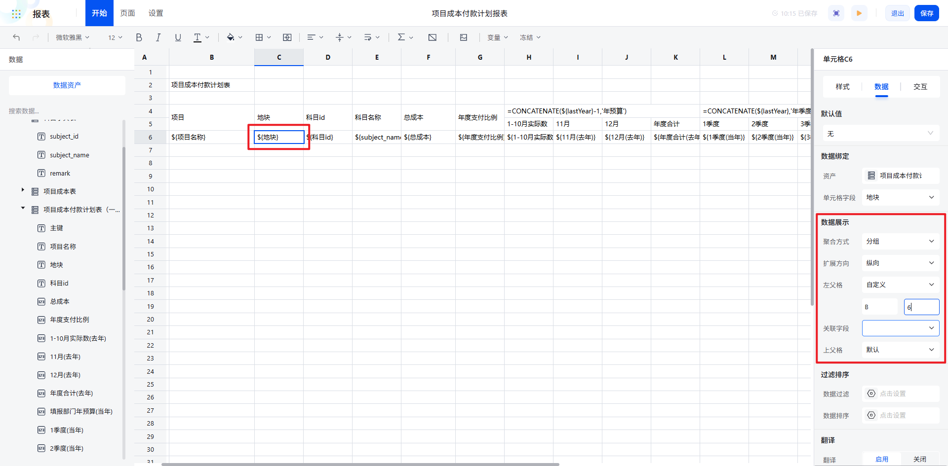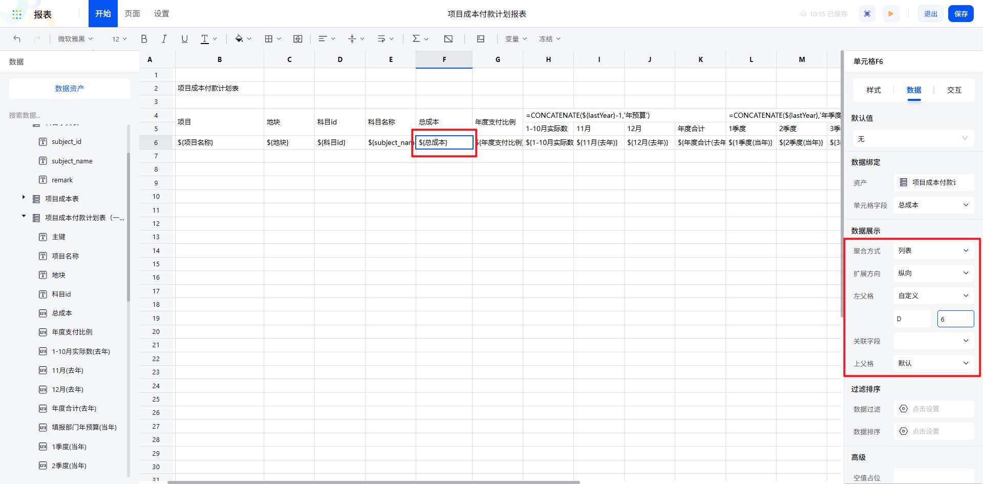 通过聚合/扩展/父格配置,报表数据自动按“项目→地块→科目”的逻辑清晰展开,数据关系一目了然。对于总成本等数值字段,设置为直接纵向扩展,左父格选择科目 id,确保数据展示的准确性。