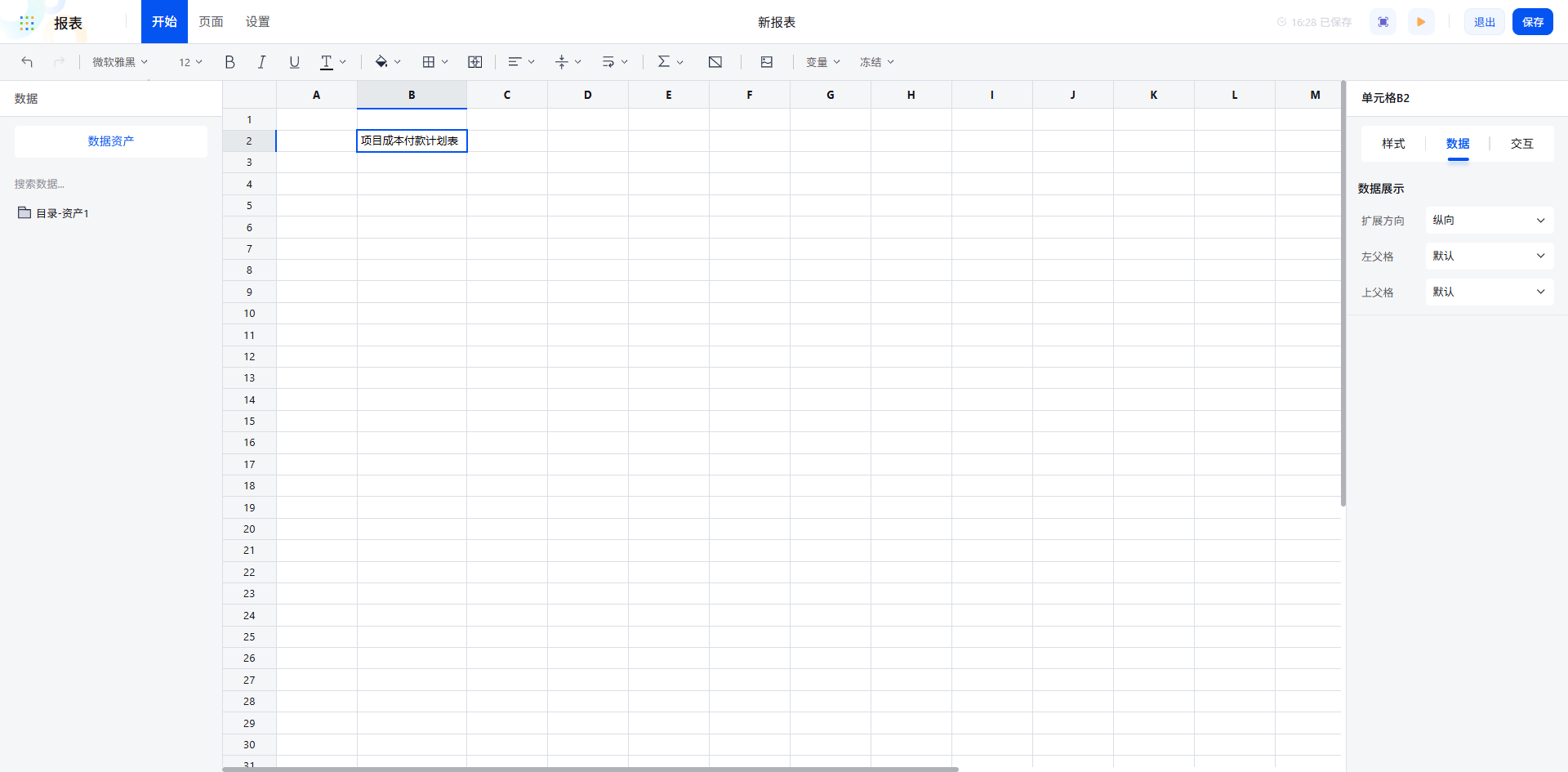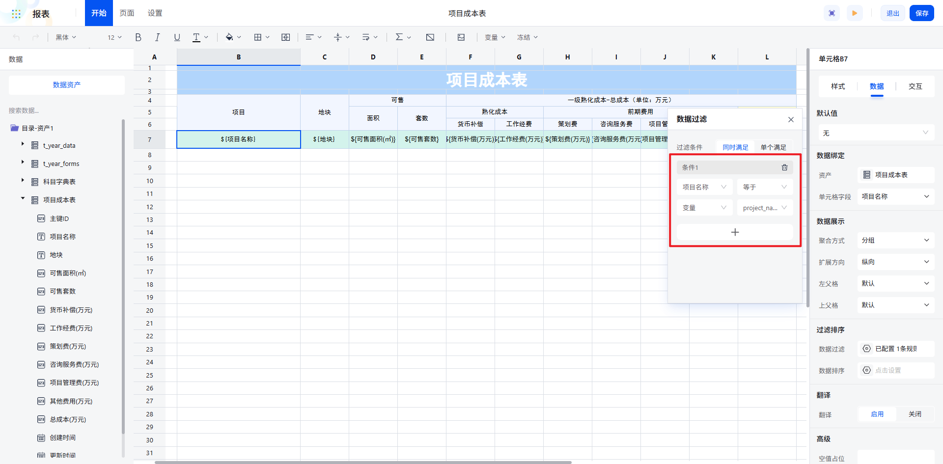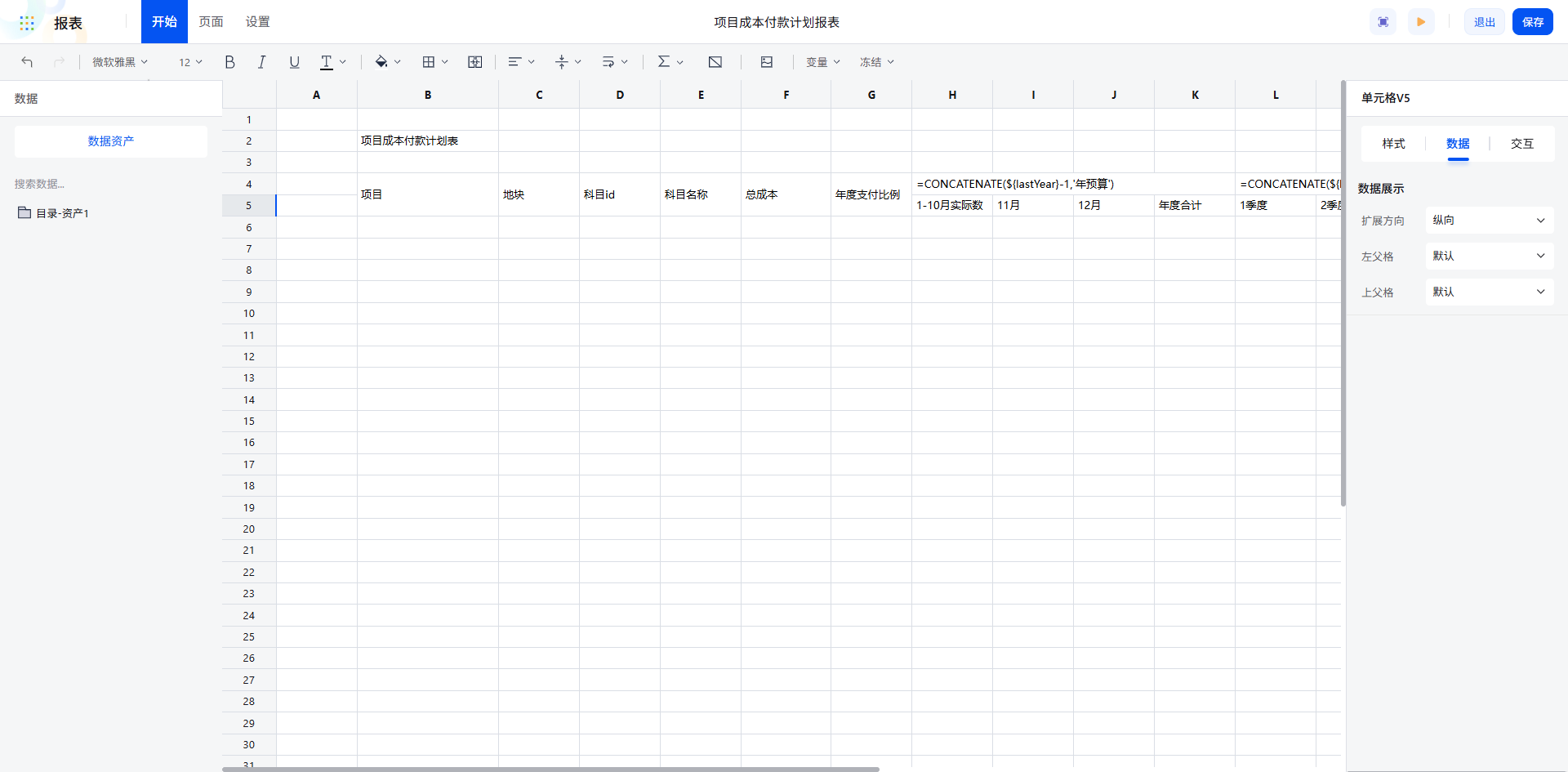 通过聚合/扩展/父格配置,报表数据自动按“项目→地块→科目”的逻辑清晰展开,数据关系一目了然。对于总成本等数值字段,设置为直接纵向扩展,左父格选择科目 id,确保数据展示的准确性。