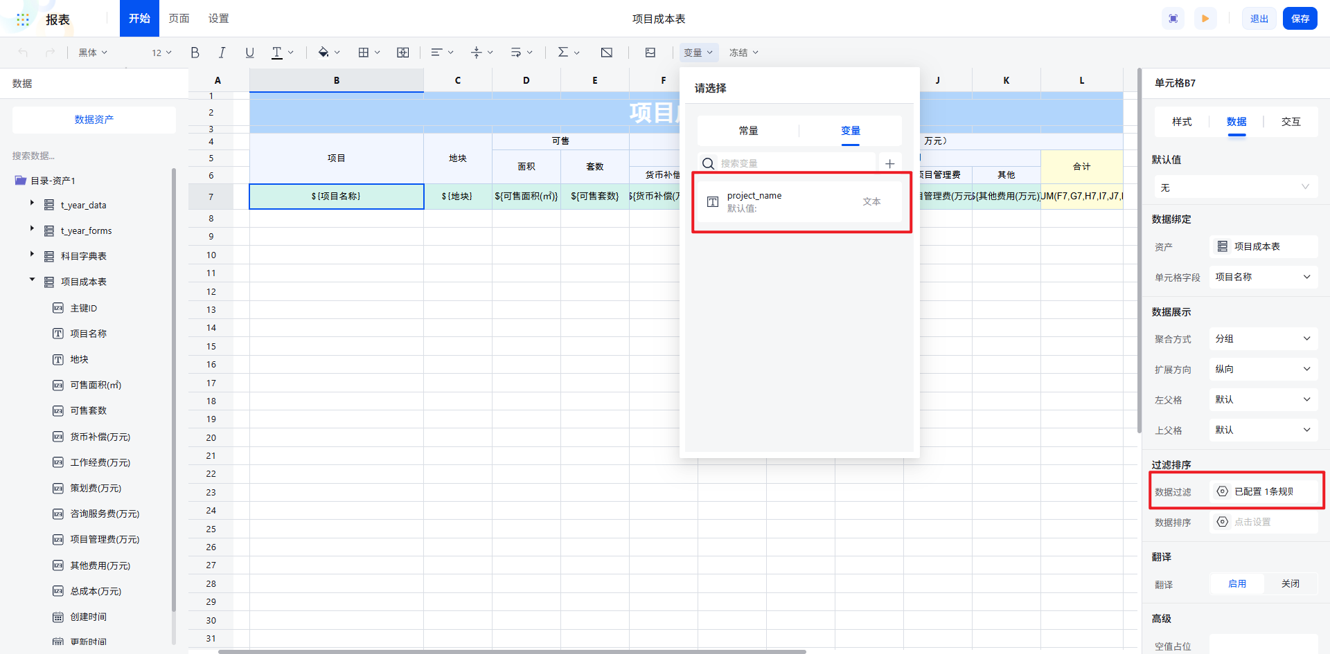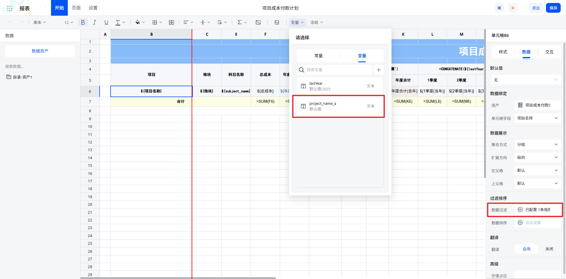 在项目成本付款计划表中项目名称同样需要根据变量设定过滤条件。
