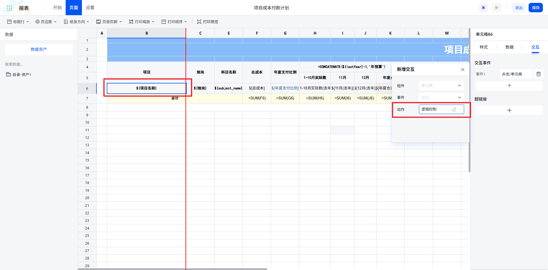 现在,我们为其赋予动态交互能力:希望项目成本付款计划表支持数据查询,同时点击“项目名称”时,可跳转至该项目的“项目成本明细报表”,实现数据的穿透查询。