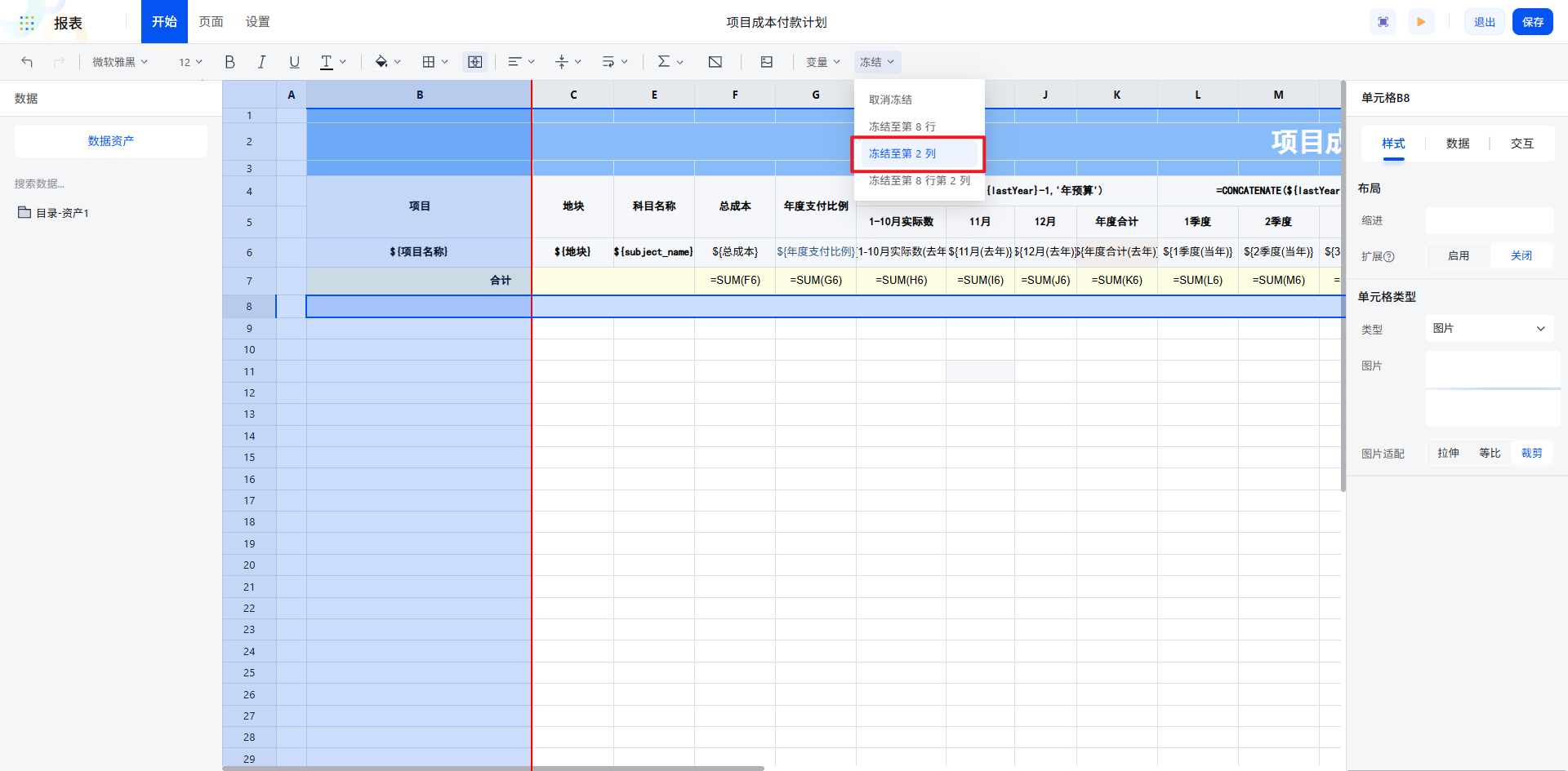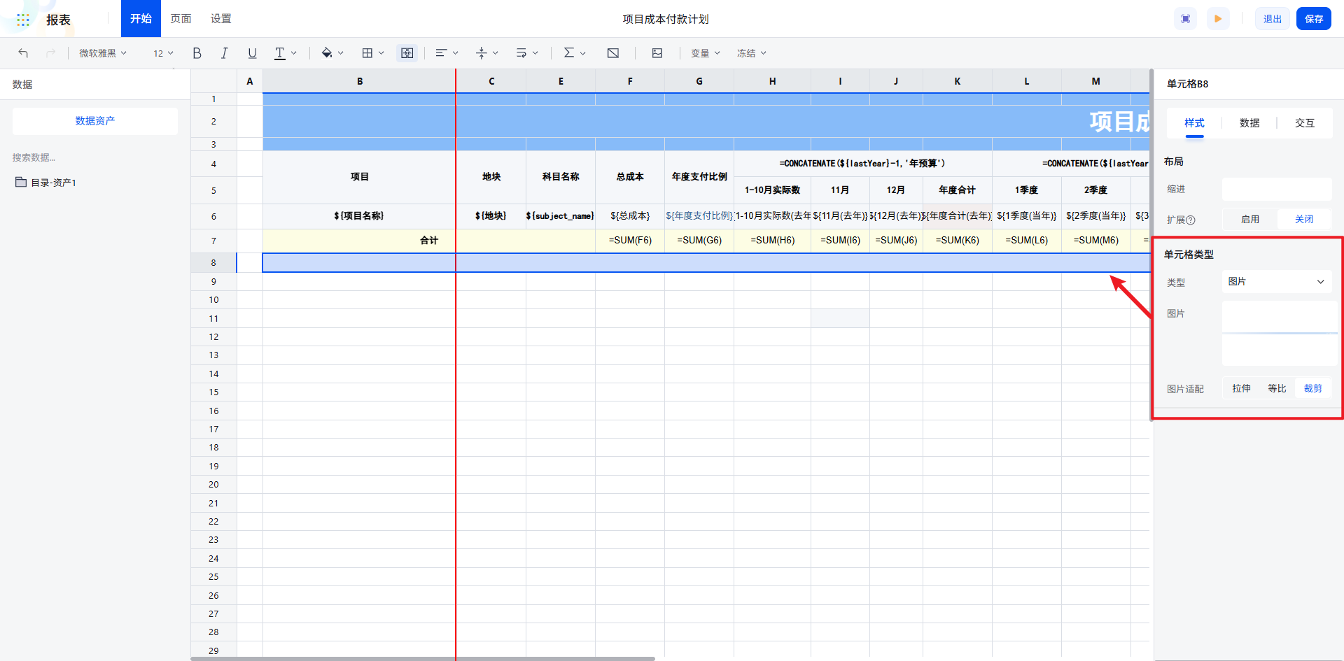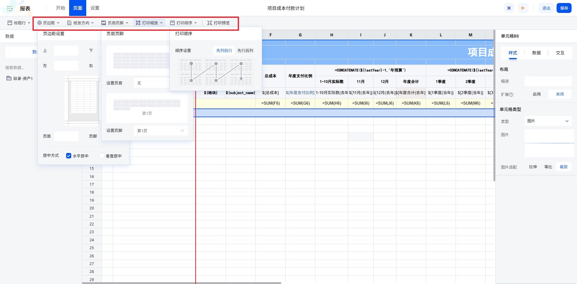 地块字段:每个项目包含多个地块,设置其分组、纵向扩展,左父格为“项目名称”所在单元格,实现按项目分组。