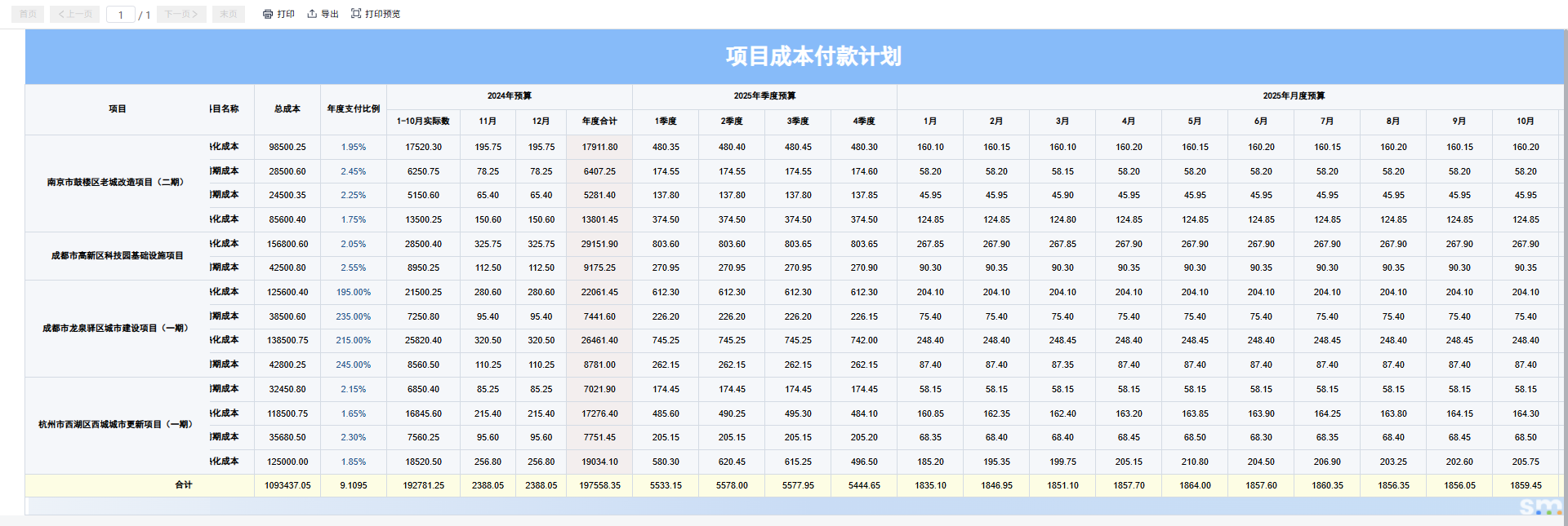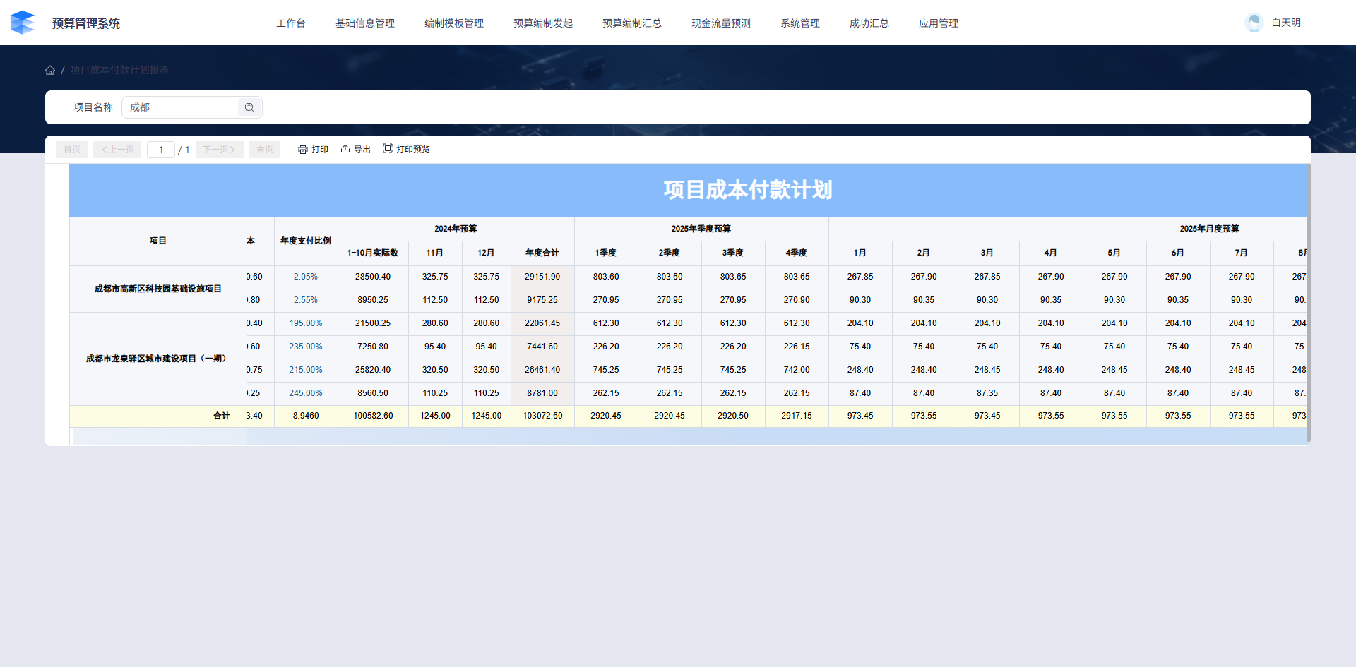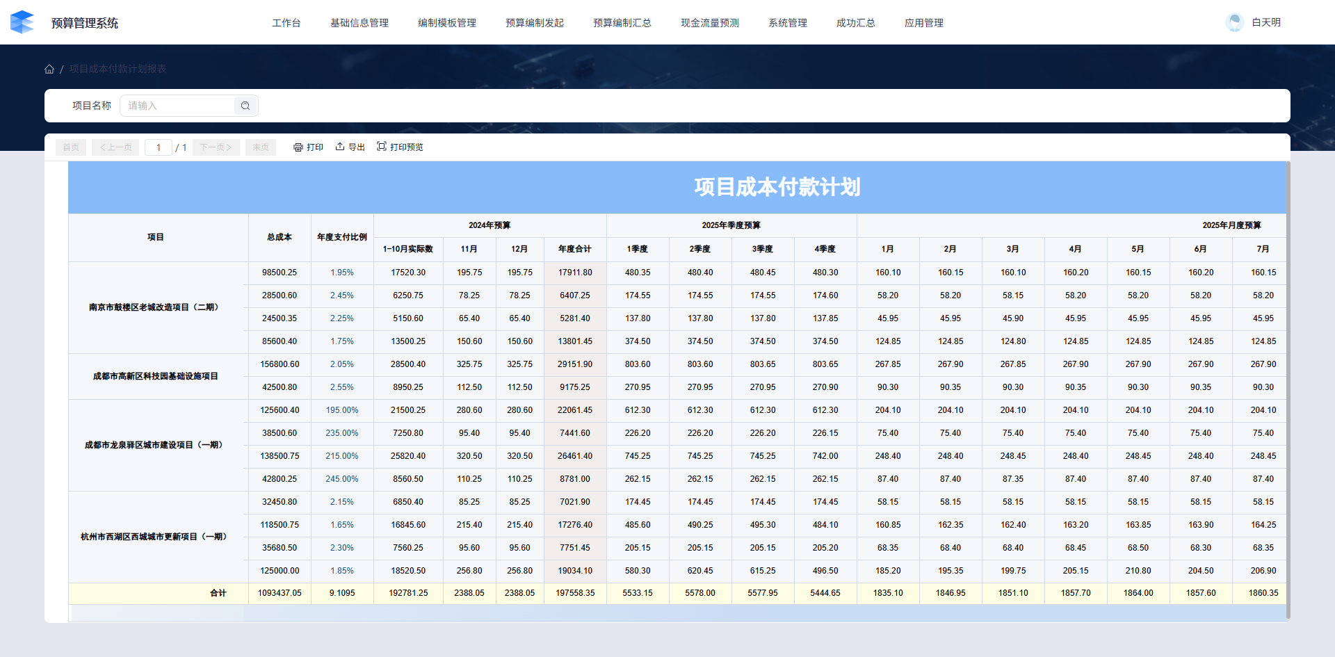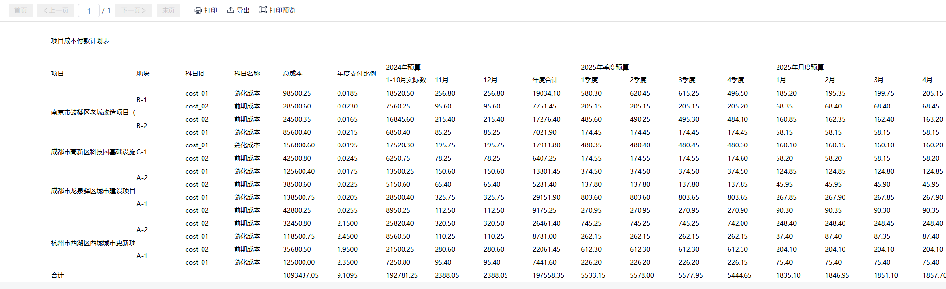 • 项目成本付款计划表:聚焦核心预算数据,清晰呈现项目名称、对应地块、费用科目、总成本,以及去年与今年的预算分配情况,帮助管理者快速掌握全量项目预算全貌。支持模糊查询项目名称,打印和导出报表数据;