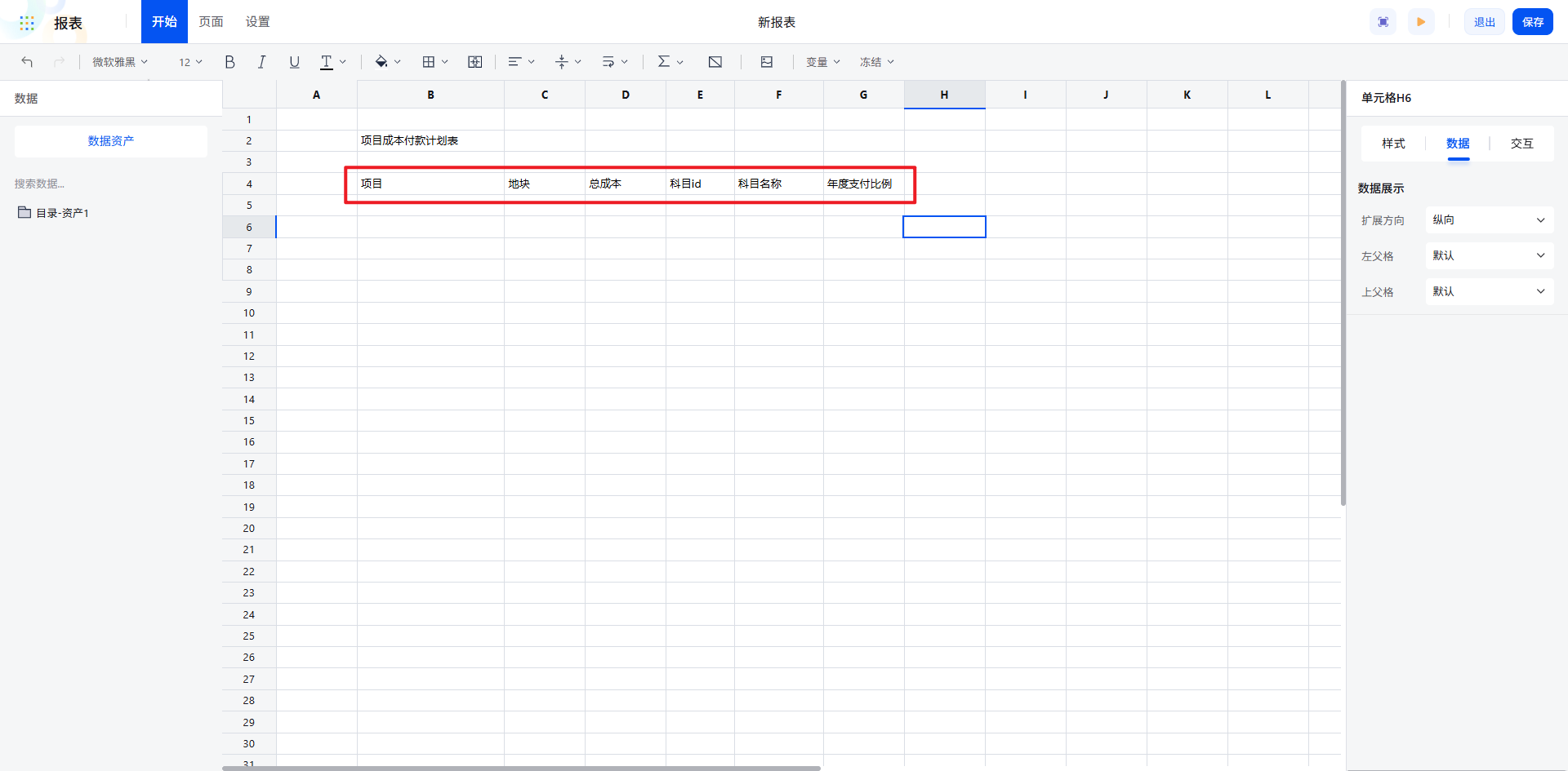 表头规划:依据业务需求依次配置列名称,包括项目名称、对应地块、费用科目、总成本等关键字段。