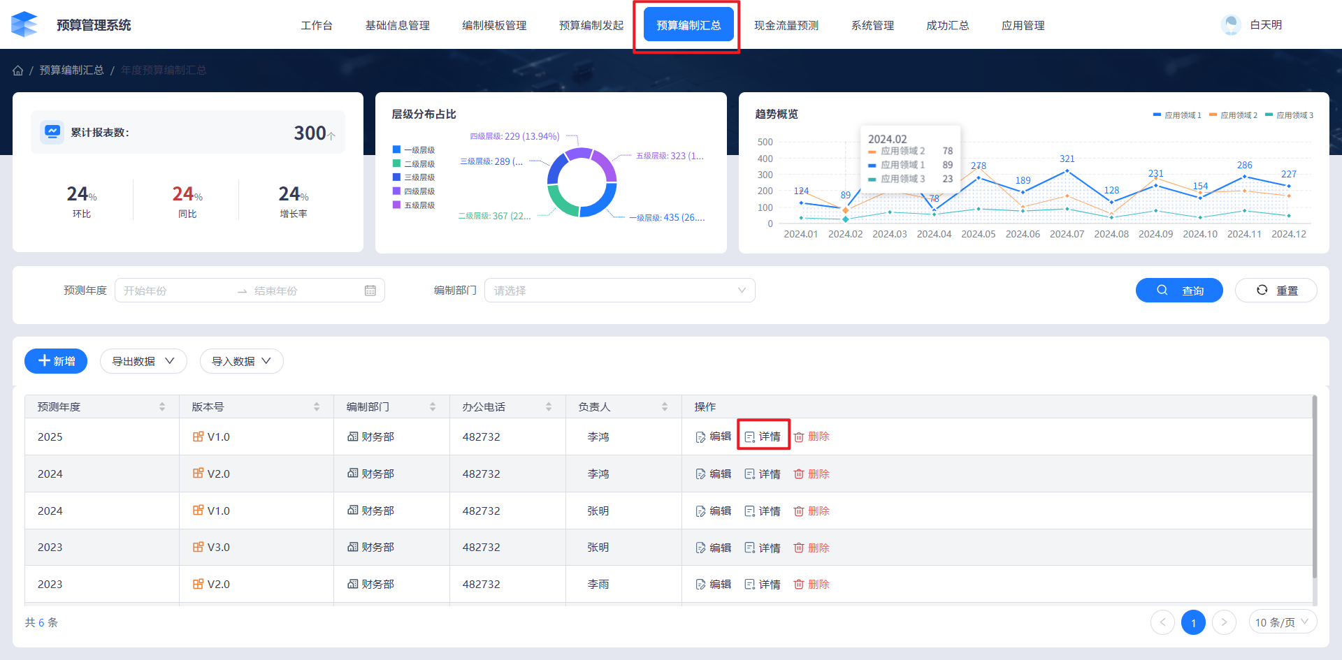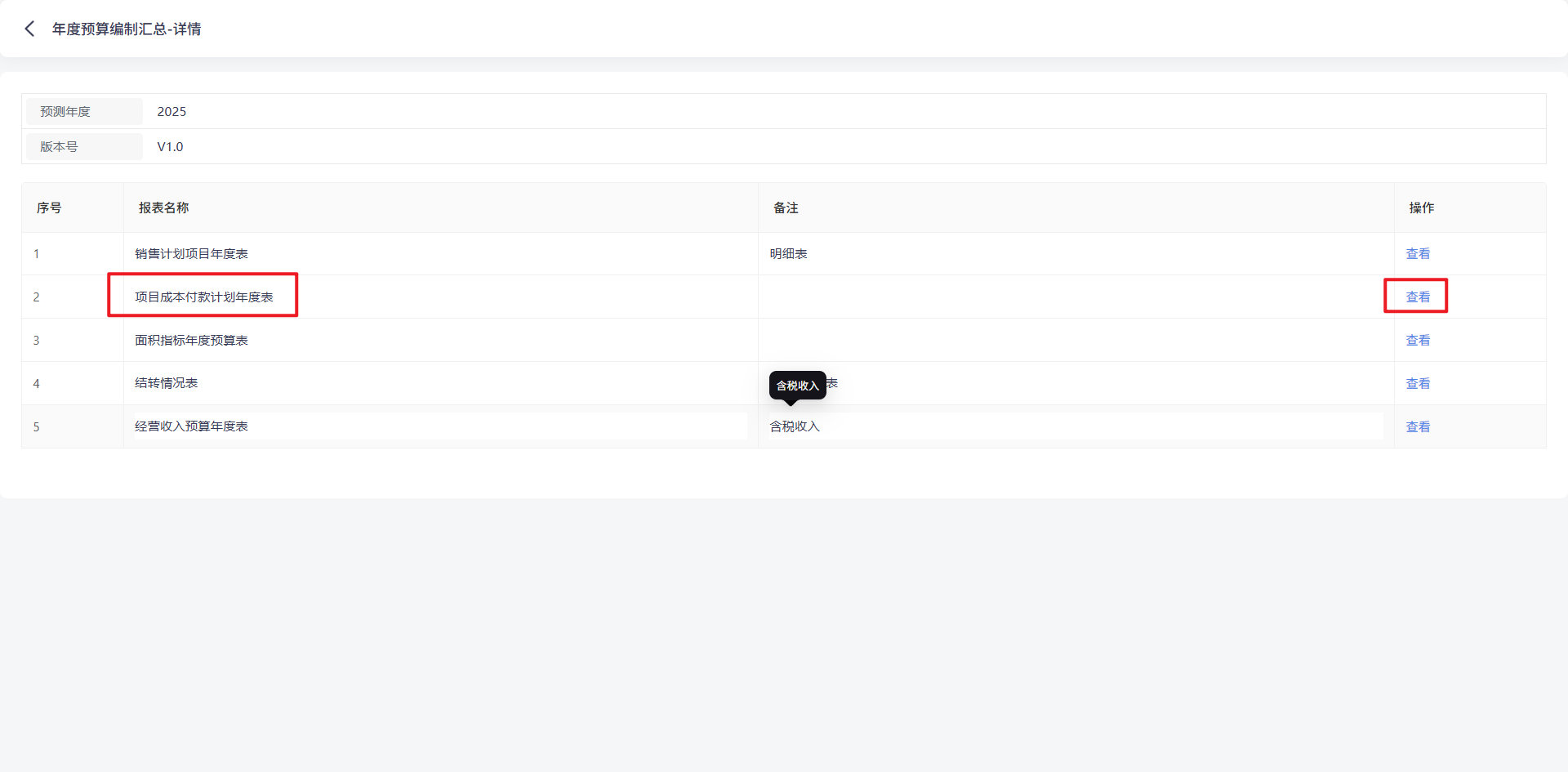 最后,为实现报表的集中管理与便捷访问,我们可将该报表绑定至预算编制汇总模块。例如,在预算编制汇总模块中选择 2025 年度、版本号为 V1.0 的业务数据,点击“详情”按钮。