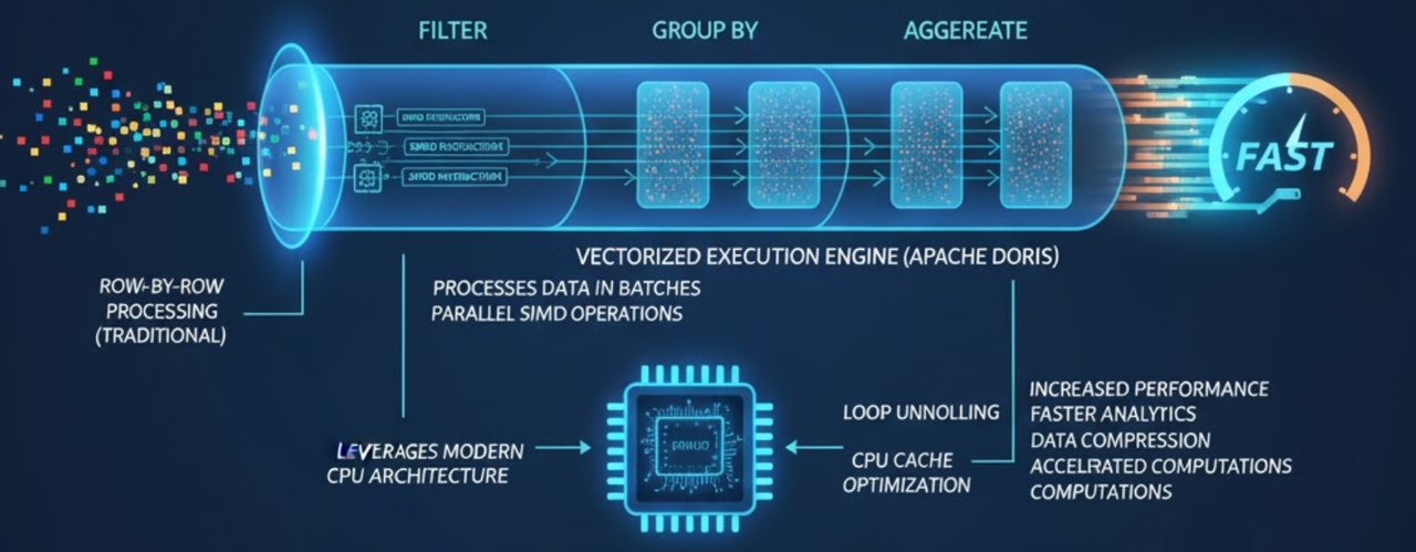 向量化查询执行是指通过批量处理数据而非逐行处理来提升查询性能的方法。该方法充分利用现代 CPU 架构的优势,借助单指令多数据流(SIMD)操作和循环展开等技术,显著提高了 CPU 的数据处理效率。在 Apache Doris 中,向量化执行引擎为实际应用场景带来了显著的查询性能提升。数据压缩、循环计算等操作也因此得到大幅加速。