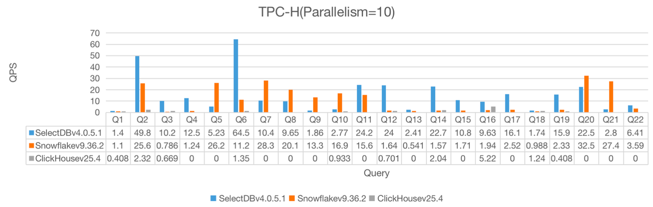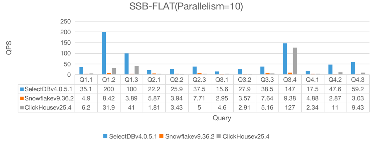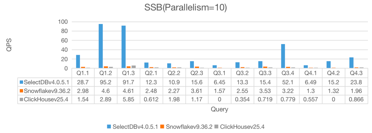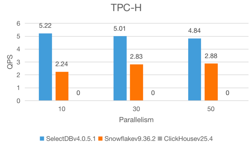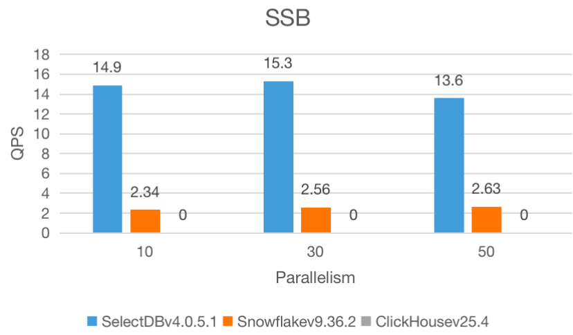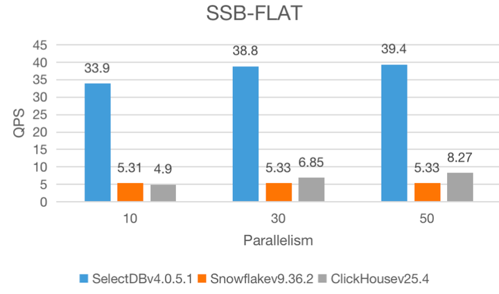 在 10、30、50 三种并行度下,SelectDB 均展现出比 Snowflake 和 ClickHouse 更高的 QPS :