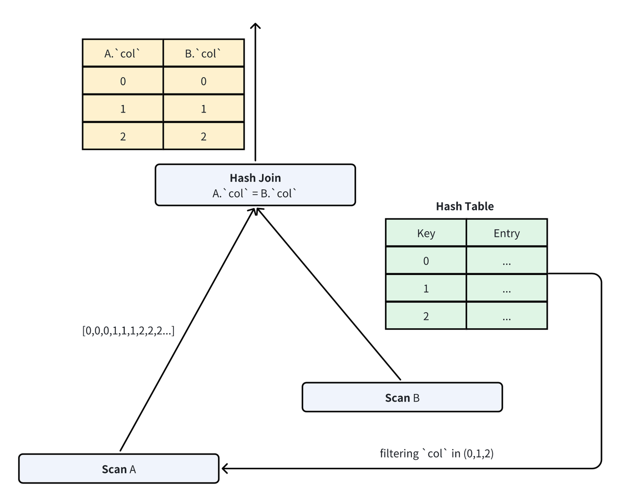 在 Hash Join 中,我们选择较小的数据表作为构建端,基于其数据构建哈希表,然后用另一侧的表作为探测端来查找哈希表。理想情况下,若忽略内存访问的影响,构建和探测单行的复杂度为 O(1),整个哈希连接的复杂度为 O(M + N)。由于探测端的数据通常较大,减少探测端数据的读取和计算显得尤为重要。
