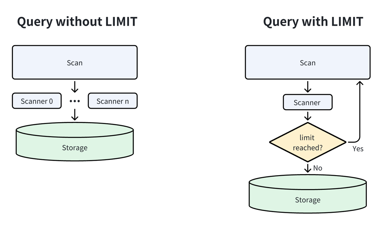 另一种数据裁剪的方法是 LIMIT 裁剪。在查询时限定返回行数是常见使用方式,具体来说:由于限制条件会被下推至查询执行过程中,一旦满足该行数限制,查询即可提前终止。