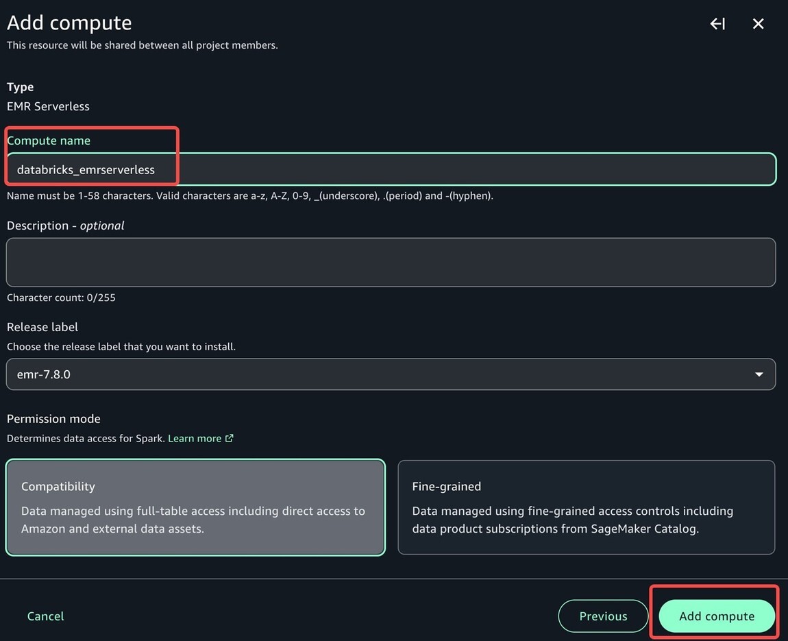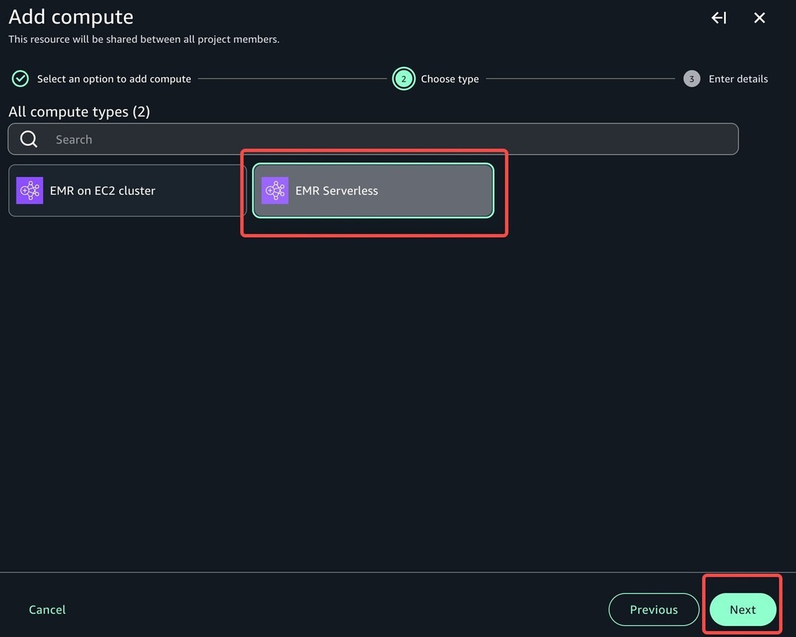 6、关于计算资源种类,我们选择 EMR Serverless , 点击 next, 修改 compute name,其他保持默认值,点击 add compute