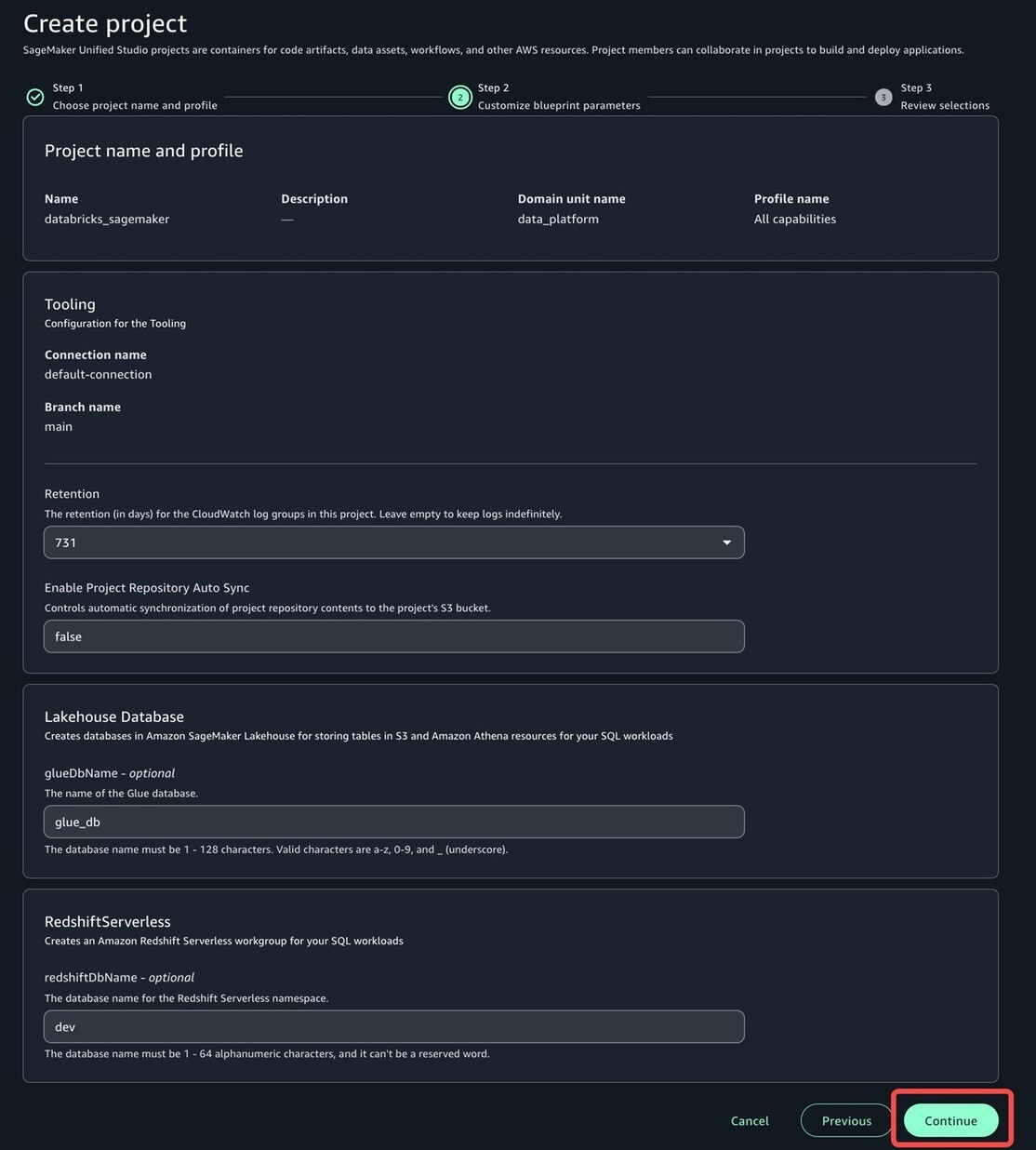 3、可以按需更改日志保留期等配置,由于在此场景下已经禁用了 glue catalog,可以忽略 lakehouse database 中的 glue database name 更改,这里保持默认设置。点击继续。跳转到下一页后再选择 创建项目。创建成功后,您将被重定向到项目主页。